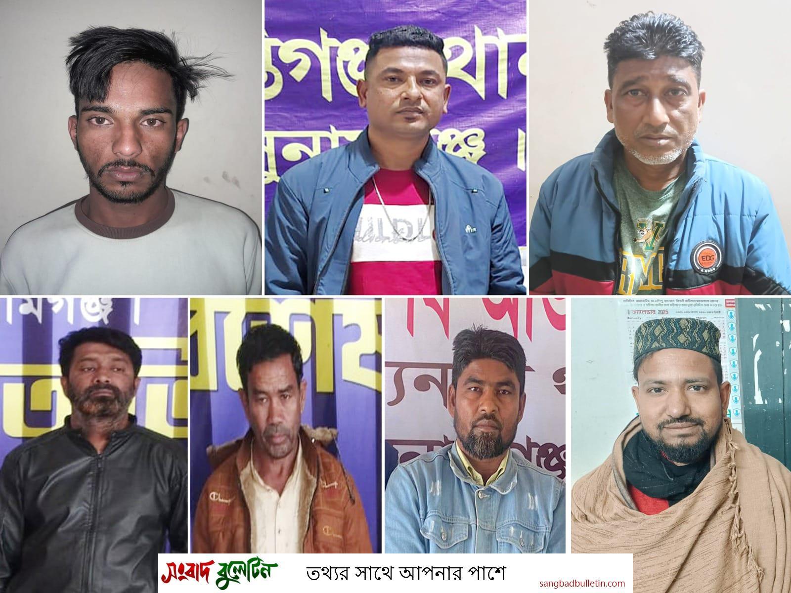 গ্রেপ্তারকৃতরা হলেন, শান্তিগঞ্জ উপজেলার নিষিদ্ধ সংগঠন ছাত্রলীগের সাবেক যুগ্ম আহবায়ক ও বগলাকাড়া গ্রামের বাসিন্দা মো. শাহান উদ্দিন (৩৩), সুনামগঞ্জ সদর থানার মঙ্গলকাটা গ্রামের বাসিন্দা রমজান আলী (৬০)। তিনি জাহাঙ্গীরনগর ইউনিয়ন আওয়ামী লীগের সহ-সভাপতি। মো. খোকন মিয়া (৪০), মধ্যনগর থানার রৌয়া গ্রামের বাসিন্দা মো. খোকন মিয়া (৪০)। তিনি বংশীকুন্ডা দক্ষিণ ইউনিয়ন শ্রমিক লীগের সভাপতি। জগন্নাথপুর থানার কেশবপুর গ্রামের বাসিন্দা মো. কামরুল হাসান তেরা মিয়া (৪০)। তিনি জগন্নাথপুর পৌরসভা আওয়ামী লীগের দপ্তর সম্পাদক। তাহিরপুর থানার সোলেমানপুর গ্রামের বাসিন্দা মো. আকরামিন হোসেন (২১)। তিনি নিষিদ্ধ সংগঠন ছাত্রলীগের দক্ষিণ শ্রীপুর ইউনিয়নের সহ-সভাপতি। ছাতক থানার নোয়াগাঁও গ্রামের বাসিন্দা জানে আলম (২৮)। তিনি ইসলামপুর ইউনিয়নের আট নম্বর ওয়ার্ড যুবলীগের সভাপতি। সুনামগঞ্জ সদর থানার ঘাসিগাঁও গ্রামের বাসিন্দা আবুল কালাম আজাদ (৪০)। তিনি জাহাঙ্গীরনগর ইউনিয়নের যুবলীগের সাবেক আহ্বায়ক।
