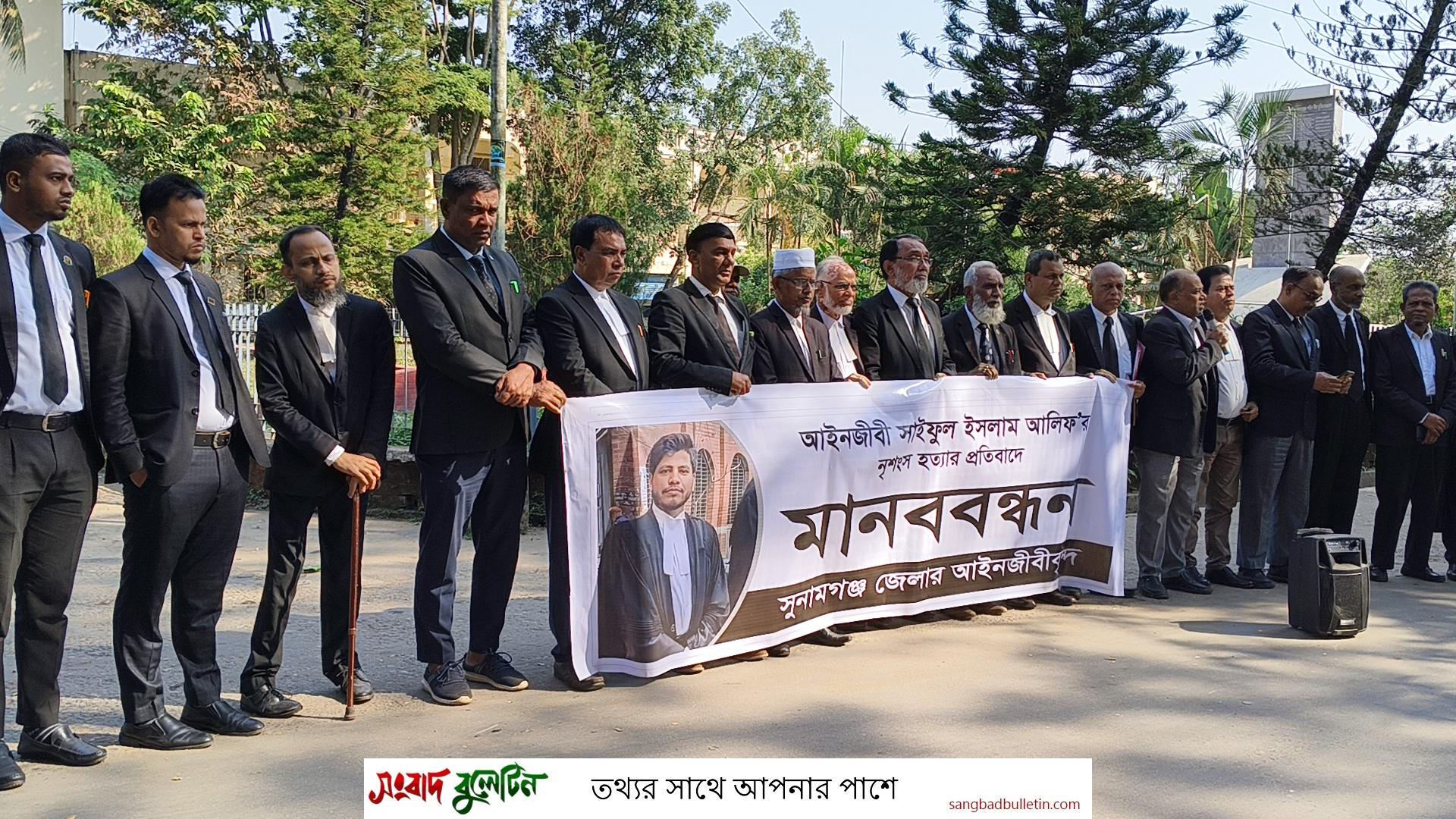 আইনজীবী সাইফুল ইসলাম আলিফ হত্যার প্রতিবাদে মানববন্ধন করেছে সুনামগঞ্জ জেলা আইনজীবী সমিতি। মঙ্গলবার সকালে আইনজীবী সমিতি ভবনের সামনে এই মানববন্ধন হয়।