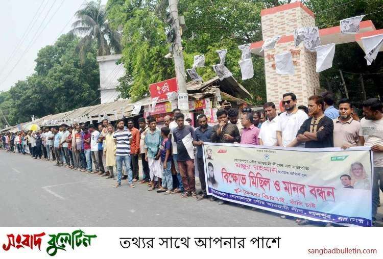 নাটোরের লালপুর উপজেলার গোপালপুর পৌর আওয়ামীলীগের সহ—সভাপতি এবং নর্থ বেঙ্গল সুগার মিলের শ্রমিক ও কর্মচারী ইউনিয়নের ভারপ্রাপ্ত সভাপতি মঞ্জুর রহমান মঞ্জু হত্যার প্রতিবাদে ও বিচারের দাবিতে মানবন্ধন করেছে পৌর আওয়ামীলীগ। সোমবার বেলা ১১ টার দিকে উপজেলা পরিষদের প্রবেশ পথের সামনে লালপুর—বনপাড়া সড়কের দুই পাশে ব্যনার নিয়ে দাড়িয়ে গোপালপুর পৌর আওয়ামীলীগ ও অঙ্গ সংগঠনের নেতা—কর্মীরা সহ স্থানীয় শত শত নারী ও পুরুষ এই কর্মসূচিতে অংশগ্রহণ করেন। এসময় বক্তব্য রাখেন,গোপালপুর পৌর আওয়ামীলীগের সাধারণ সম্পাদক সৈয়দ আরশাদ হোসেন সাধীর, আওয়ামীলীগ নেতা ফিরোজ আল হক ভূইঁয়া, পৌর যুবলীগের সভাপতি নাজমুল হোসেন, নিহত মঞ্জুর ছোট ভাই মোস্তাক হোসেন প্রমুখ। বক্তারা ,আওয়ামীলীগ নেতা মঞ্জুর রহমান মঞ্জু হত্যার প্রধান আসামি হাসান আলী টুমনকে আইনের আওতায় এনে বিচারের মাধ্যমে ফাঁসি দেওয়ার দাবি জানান। জানা যায়,৩০ এপ্রিল রাত সাড়ে ১০ টার দিকে গোপালপুর পৌর এলাকার আজিমনগর রেলওয়ে স্টেশন ভবনের পাশে রবিউলের কনফেকশনারী দোকানের সামনে আওয়ামীলীগ নেতা মঞ্জুরকে গুলি করে চলে যায় দুবৃর্ত্তরা। মঞ্জুর ঘটনাস্থলে মৃত্যু হয় বলে জানা গেছে। এঘটনায় নিহত মঞ্জুর ভাই মাসুদ রানা বাদি হয়ে স্থানীয় থানায় ১৬ জনের নামে একটি হত্যা মামলা দায়ের করেছেন।