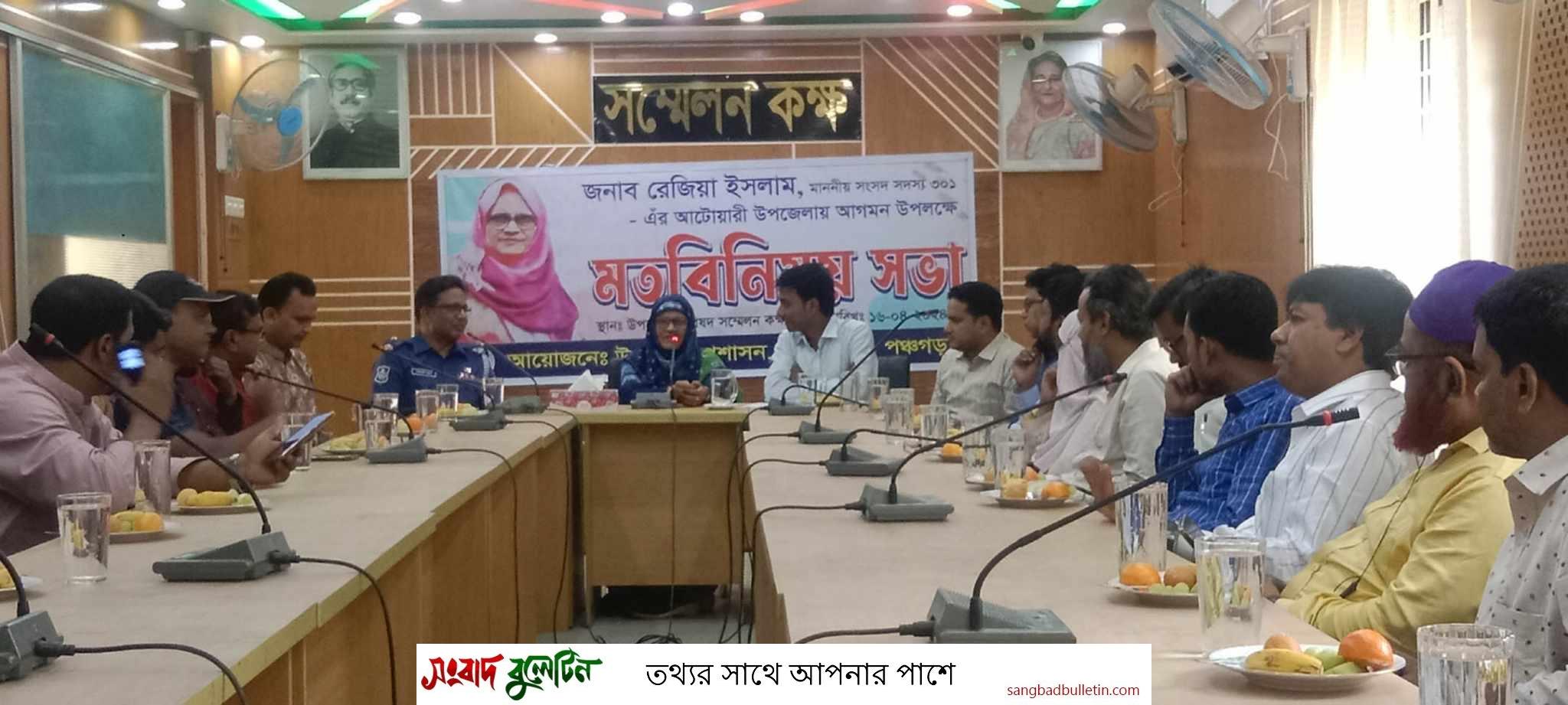 আটোয়ারী উপজেলা প্রশাসনের আয়োজনে মঙ্গলবার বিকেলে পরিষদের সম্মেলন কক্ষে উপজেলা নির্বাহী অফিসার শাফিউল মাজলুবিন রহমানের সভাপতিত্বে অনুষ্ঠিত মতবিনিময় সভায় প্রধান অতিথির বক্তব্য রাখেন সংরক্ষিত আসন-৩০১ এর সংসদ সদস্য রেজিয়া ইসলাম।