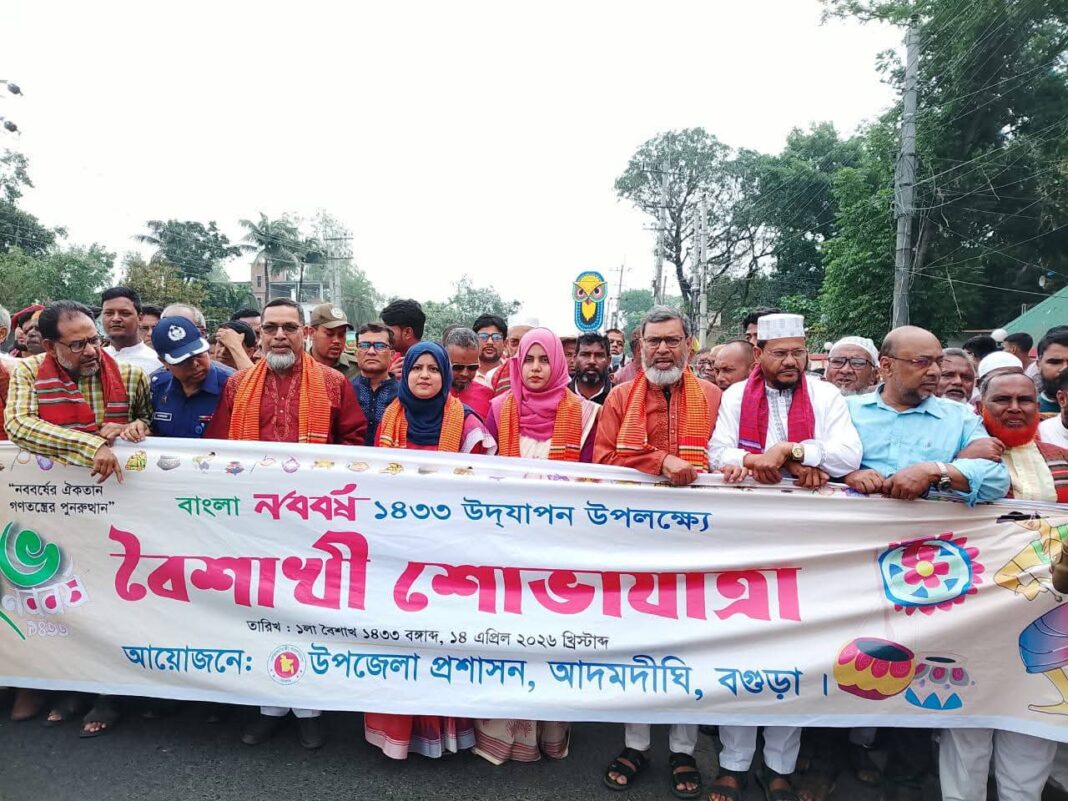 বগুড়ার আদমদীঘিতে উপজেলা প্রশাসনের উদ্যোগে নানা আয়োজনের মধ্য দিয়ে উদযাপিত হয়েছে বাংলা নববর্ষ ১৪৩৩। মঙ্গলবার সকাল ৯টায় জাতীয় সংগীত ও ‘এসো হে বৈশাখ’ সংগীত পরিবেশনের মাধ্যমে শুরু হয় নববর্ষের শুভ সূচনা। এই উপলক্ষে উপজেলা নির্বাহী অফিসার মাসুমা বেগমের সভাপতিত্বে পরিষদ চত্বর থেকে এক বর্ণাঢ্য আয়োজনে বৈশাখী শোভাযাত্রা বের করা হয়। শোভাযাত্রাটি বাসস্ট্যান্ড ঘুরে পুনরায় পরিষদ চত্বরে এসে শেষ হয়। এতে অংশগ্রহণ করেন সাংসদ আব্দুল মহিত তালুকদার, উপজেলা সহকারী কমিশনার (ভূমি) মাহমুদা সুলতানা, উপজেলা মৎস্য অফিসার নাহিদ হোসেন, থানার অফিসার ইনচার্জ কামরুজ্জামান মিয়া, উপজেলা প্রকৌশলী রিপন কুমার সাহা, উপজেলা বিএনপির সহ-সভাপতি আব্দুল মুক্তাকিন তালুকদার, সাধারণ সম্পাদক আবু হাসান, জেলা সমাজকল্যাণ বিষয়ক সম্পাদক মাহফুজুল হক টিকন, উপজেলা জামায়াতে ইসলামীর আমির আতোয়ার হোসেন, ইউপি চেয়ারম্যান ও সদস্যসহ উপজেলার বিভিন্ন দফতরের কর্মকর্তা-কর্মচারী, শিক্ষক-শিক্ষার্থী, নানা শ্রেণি-পেশার মানুষ। শোভাযাত্রা শেষে অনুষ্ঠিত হয় মনোজ্ঞ সাংস্কৃতিক অনুষ্ঠান, যা উৎসবে যোগ করে বাড়তি প্রাণচাঞ্চল্য। পাশাপাশি, আদমদীঘি ঈশ্বর পূর্ণ জয় পাইলট উচ্চ বিদ্যালয় মাঠে আয়োজন করা হয়েছে ৭ দিনব্যাপী বৈশাখী মেলা, যেখানে স্থানীয় সংস্কৃতি ও ঐতিহ্যের নানা উপকরণ স্থান পেয়েছে।