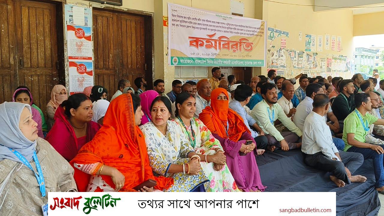 বাংলাদেশ জুডিশিয়াল সার্ভিস বেতন স্কেলের আলোকে বেতন-ভাতা ও স্বতন্ত্র নিয়োগবিধি প্রণয়নের দাবিতে দুই দফা দাবিতে সুনামগঞ্জে বিচার বিভাগীয় কর্মচারী এসোসিয়েশনের কর্মবিরতি অনুষ্ঠিত হয়েছে। কেন্দ্রীয় কর্মসূচির অংশ হিসেবে সোমবার সকাল সাড়ে ৯টা থেকে বেলা সাড়ে ১১টা পর্যন্ত সুনামগঞ্জ জজ কোর্ট প্রাঙ্গণে এই কর্মবিরতি পালন করেন কর্মচারীরা। কর্মবিরতিতে সুনামগঞ্জের বিচার বিভাগীয় সকল কর্মচারীরা উপস্থিত ছিলেন।
