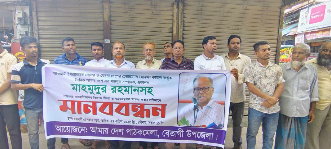 আমার দেশ সম্পাদক ও প্রকাশক মাহমুদুর রহমানসহ চারজন সাংবাদিকদের বিরুদ্ধে মেঘনা গ্রুপের চেয়ারম্যান মোস্তফা কামালের করা মিথ্যা ও ষড়যন্ত্রমূলক মামলা প্রত্যাহারের দাবিতে বরগুনার বেতাগী মানববন্ধন অনুষ্ঠিত হয়েছে।