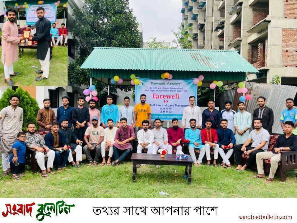 বিদায়ী শিক্ষার্থী সোলাইমান হোসাইন বলেন, ‘ল অ্যান্ড ল্যান্ড ম্যানেজমেন্ট বিভাগের জুনিয়রা এই বিদায়ী সংবর্ধনার আয়োজন করেছেন এজন্য তাদের প্রতি কৃতজ্ঞতা প্রকাশ। শেখ রাসেল হল থেকে এটাই প্রথম বারের মতো কোনো বিভাগের বিদায়ী সংবর্ধনা অনুষ্ঠিত হয়েছে৷ হলের জুনিয়র শিক্ষার্থীরা অনুষ্ঠানের প্রতিটি কার্যক্রম এত সুন্দর ভাবে পরিচালনা করেছ, তাদের এই আয়োজনে আমরা সবাই মুগ্ধ হয়েছি। তাদের সবার প্রতি অশেষ ভালোবাসা জানাচ্ছি এবং তাদের সবার কাছে আমাদের জন্য দোয়া ও ভালোবাসা প্রত্যাশা করছি।’