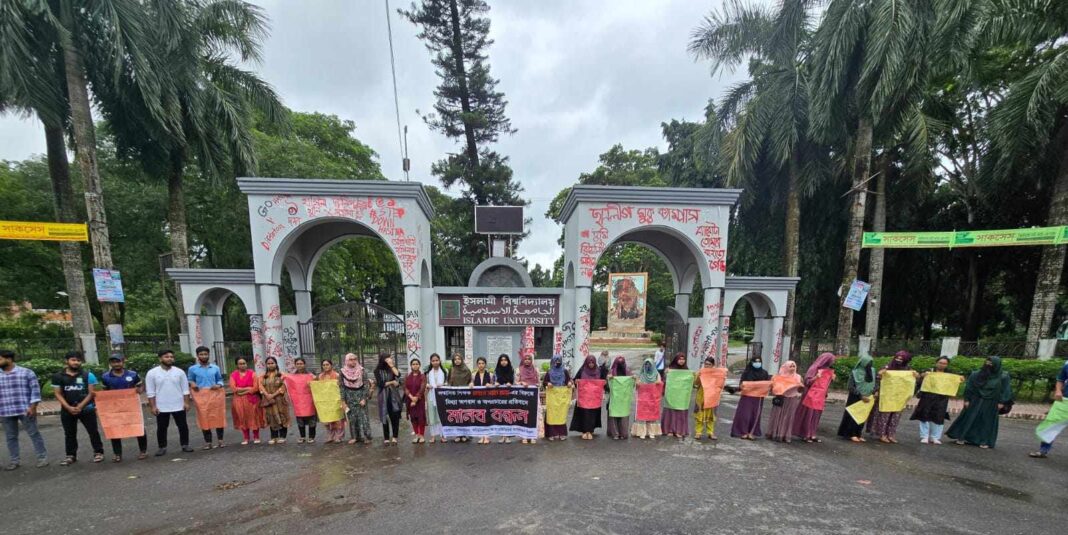ইসলামী বিশ্ববিদ্যালয়ের কমিউনিকেশন অ্যান্ড মাল্টিমিডিয়া জার্নালিজম বিভাগের শিক্ষক তন্ময় সাহা জয়ের বিরুদ্ধে ‘গণহত্যার সমর্থনকারী’ হিসেবে অপপ্রচারের অভিযোগে ক্ষুব্ধ শিক্ষার্থীরা মানববন্ধন ও বিক্ষোভ মিছিল করেছেন। শনিবার (১৪ সেপ্টেম্বর) দুপুর ১২টার দিকে বিভাগের শিক্ষার্থীরা মীর মশাররফ হোসেন ভবন থেকে মিছিল শুরু করে বিশ্ববিদ্যালয়ের বিভিন্ন সড়ক প্রদক্ষিণ করেন। এরপর প্রধান ফটকে গিয়ে তারা মানববন্ধনের মাধ্যমে তাদের প্রতিবাদ জানান।