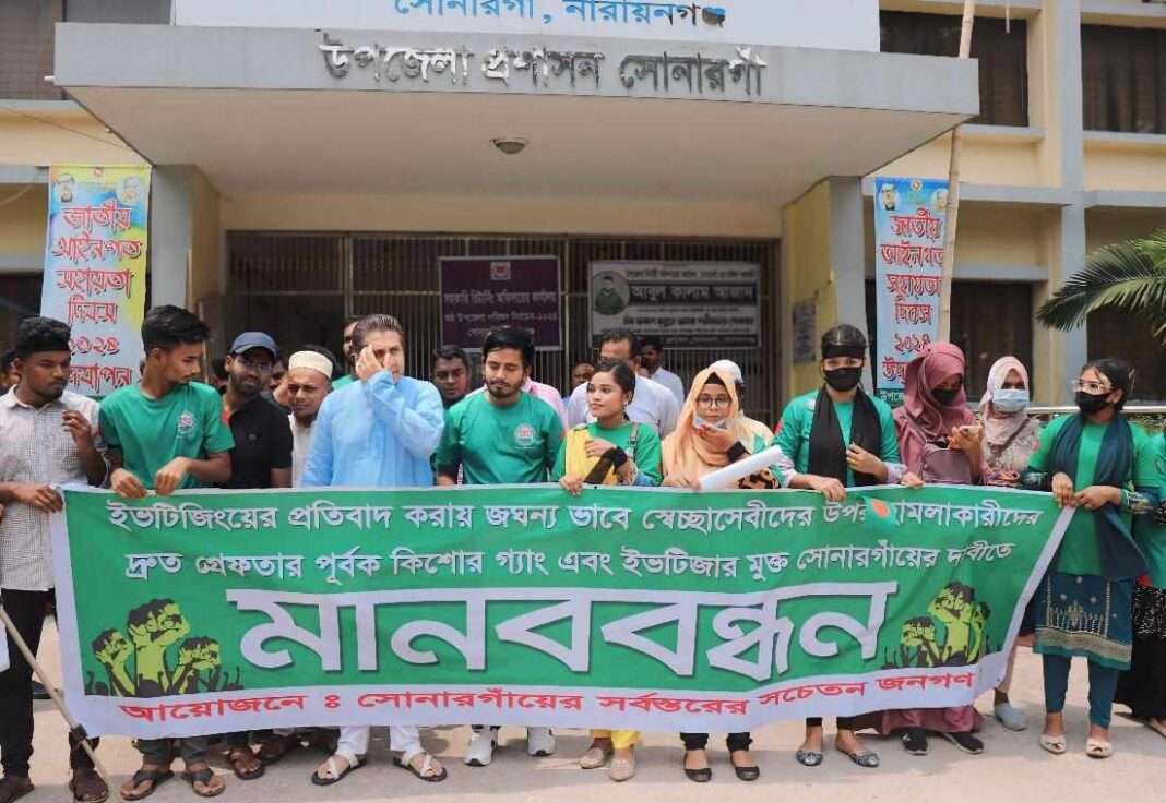 মানববন্ধনে বিডি ক্লিন সোনারগাঁ শাখার সমন্বায়ক কামরুজ্জামান রানা বলেন, কিছুদিন আগে একটি ইভেন্ট শেষে ফেরার পথে বিডি ক্লিন সদস্যরা ইভটিজিংয়ের শিকার হয়। এই ঘটনার প্রতিবাদ করায় অপর সদস্যদের ওপর হামলা চালানো হয়। এই ঘটনার তীব্র নিন্দা জানাই। ইভটিজার ও কিশোর গ্যাং নির্মূলে সামাজিকভাবে আন্দোলন গড়ে তুলতে হবে।’
