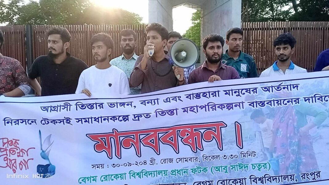 বন্যা ও বাস্তুহারা মানুষের আর্তনাদ নিরসনে টেকসই সমাধান কল্পে দ্রুত তিস্তা মহাপরিকল্পনা বাস্তবায়নে দাবিতে মানববন্ধন করেছে বেগম রোকেয়া বিশ্ববিদ্যালয় শিক্ষার্থীরা।