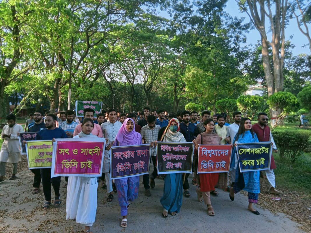 শুক্রবার বিকেলে উপাচার্য নিয়োগের দাবিতে বিশ্ববিদ্যালয়ের বটতলা থেকে মিছিল বের করেন শিক্ষার্থীরা। তারা মিছিলটি নিয়ে ক্যাম্পাসের বিভিন্ন সড়ক প্রদক্ষিণ শেষে কুষ্টিয়া-খুলনা মহাসড়কে অবস্থান নেন। এসময় ওই মহাসড়কে তীব্র যানজটের সৃষ্টি হয়। বিক্ষোভ মিছিলে শিক্ষার্থীরা ‘রেকর্ড দেখে ভিসি দিন দুর্নীতির খবর নিন, ক্লিন ইমেজের ভিসি চাই, ক্লাস চাই পরীক্ষা চাই অবিলম্বে ভিসি চাই, সেশনজটের কবর চাই, সংস্কার মনা ভিসি চাই, সৎ ও সাহসী ভিসি চাই, ইবির আঙিনায় দুর্নীতির ঠাঁই নাইসহ বিভিন্ন প্ল্যাকার্ড নিয়ে অংশ নেন।