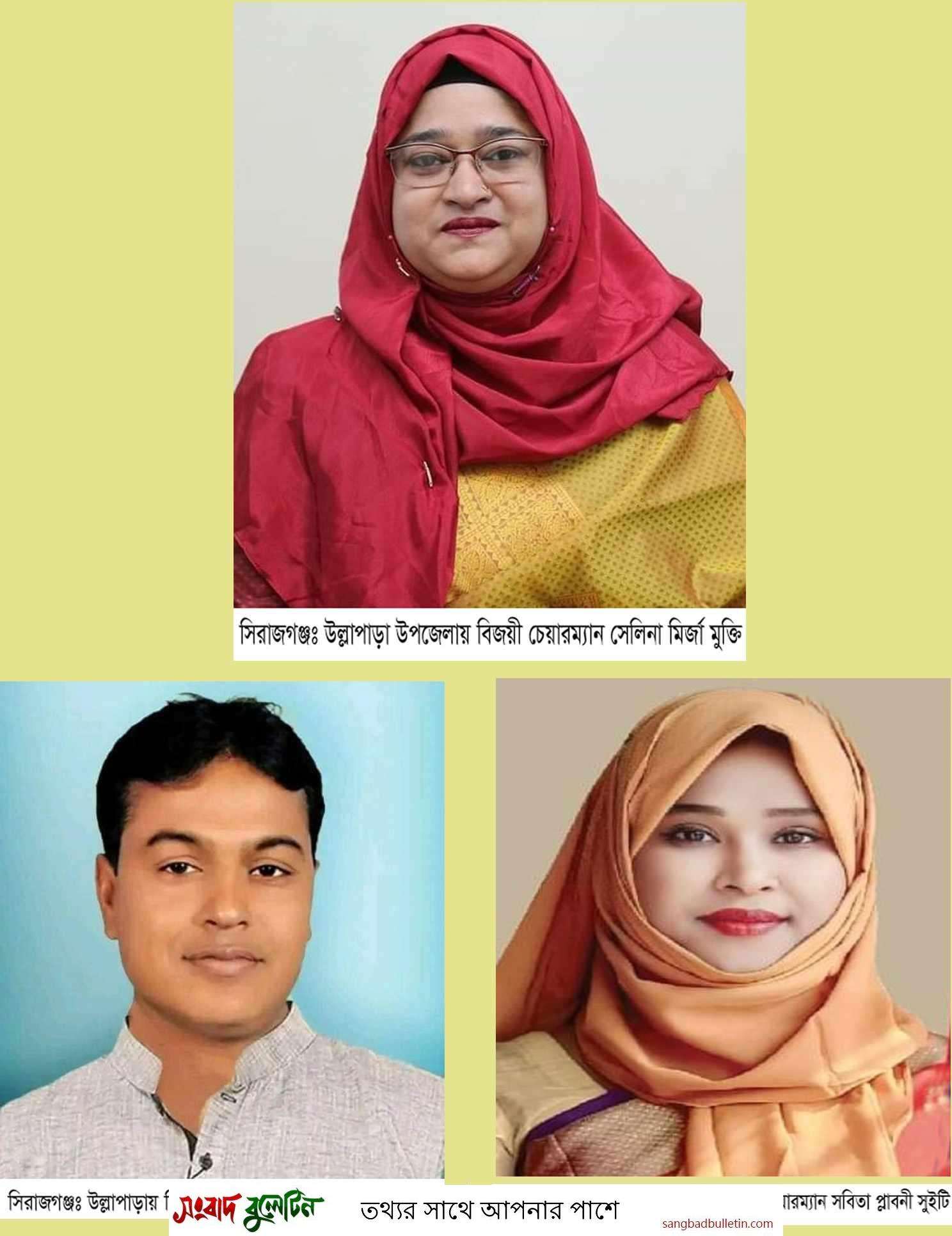 সিরাজগঞ্জ প্রতিনিধিঃ দ্বিতীয় ধাপে মঙ্গলবার অনুষ্ঠিত উল্লাপাড়া উপজেলা পরিষদ নির্বাচনে চেয়ারম্যান পদে নির্বাচিত হয়েছেন উপজেলা আওয়ামী লীগের যুগ্ম সাধারন সম্পাদক সেলিনা মির্জা মুক্তি । তিনি পেয়েছেন মোট ৮৯০১৮ ভোট। তার নিকটতম প্রতিদ্ব›দ্বী নবী নেওয়াজ খান পেয়েছেন ২২০২৩ ভোট। নির্বাচনে ভাইস চেয়ারম্যান পদে নির্বাচিত হয়েছেন মোঃ আবু সাইদ স্বপন। তিনি পেয়েছেন ৫৮৩৫০ ভোট। তার নিকটতম প্রতিদ্ব›দ্বী মনিরুজ্জামান পান্না পেয়েছেন ৪৬০০৯ ভোট এবং মহিলা ভাইস চেয়ারম্যান পদে নির্বাচিত হয়েছেন সবিতা প্লাবনী সুইটি। তিনি পেয়েছেন ৫৬৯৬০ ভোট। তার নিকতটম প্রতিদ্ব›দ্বী মোছাঃ সুমাইয়া পারভীন পেয়েছেন ২৯৮৪৮ ভোট। সুষ্ঠু ও শান্তিপূর্ণ উপায়ে নির্বাচন অনুষ্ঠিত হয়। উপজেলা নির্বাহী অফিসার ও সহকারী রিটার্নিং কর্মকর্তা সানজিদা সুলতানা বিষয়টি নিশ্চিত করেছেন।