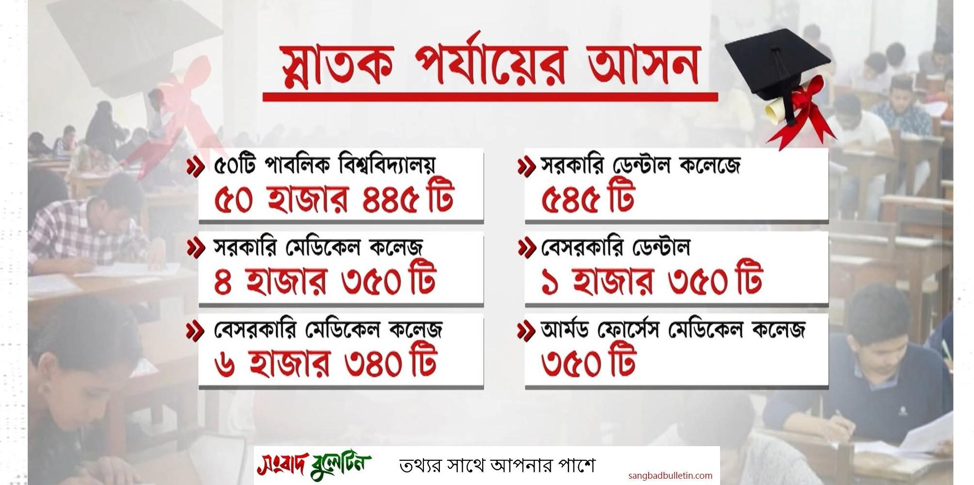 ইউজিসির তথ্যমতে, ৫০টি পাবলিক বিশ্ববিদ্যালয়ে স্নাতক পর্যায়ে আসনসংখ্যা ৫০ হাজার ৪৪৫টি, সরকারি মেডিকেল কলেজে আসন রয়েছে ৪ হাজার ৩৫০টি, বেসরকারি মেডিকেল কলেজে ৬ হাজার ৩৪০টি, সরকারি ডেন্টাল কলেজে ৫৪৫টি, বেসরকারি ডেন্টালে ১ হাজার ৩৫০ জন, আর্মড ফোর্সেস মেডিকেল কলেজে ৩৫০টি, ১০৭টি বেসরকারি বিশ্ববিদ্যালয়ের অনার্স কোর্সে ১ লাখ ৮৬ হাজার ৮৯৯টি, পাস কোর্সে ১ হাজার ১৬০টি, ঢাকার সরকারি ৭ কলেজে ২৩ হাজার ৬৩০টি, জাতীয় বিশ্ববিদ্যালয়ের অধিভুক্ত কলেজগুলোতে স্নাতক (পাস), স্নাতক (সম্মান), স্নাতক কারিগরি/সমমান পর্যায়ে সরকারি-বেসরকারি কলেজে ৯ লাখ ৪৬ হাজার ৯৫টি, ইসলামী আরবি বিশ্ববিদ্যালয়ের অধীনে বিভিন্ন মাদ্রাসায় ৬৪ হাজার ৫২৯টি, উন্মুক্ত বিশ্ববিদ্যালয়ে ৮৭ হাজার ৫৯৩টি, ইঞ্জিনিয়ারিং কলেজে ৭২০টি, টেক্সটাইল কলেজে ৭২০টি, মেরিন কলেজে ৬৬০টি, ঢাকা, চট্টগ্রাম ও রাজশাহী বিশ্ববিদ্যালয়ের অধিভুক্ত কলেজে ৩ হাজার ৭৯০টি, আন্তর্জাতিক বিশেষায়িত বিশ্ববিদ্যালয়ে ৮০০টি, নার্সিং ও মিডওয়াইফারিতে ৫ হাজার ৬০০টি আসন রয়েছে।