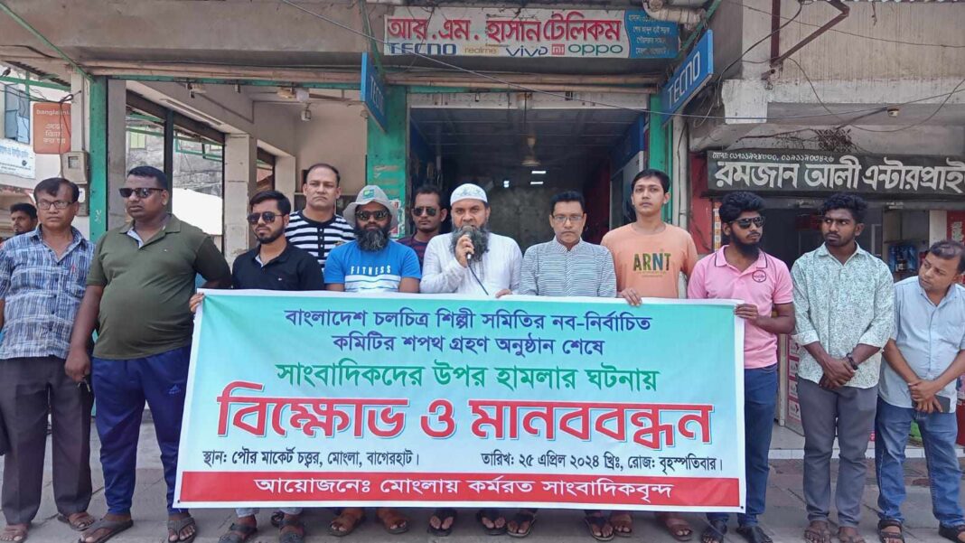 সাংবাদিক আলী আজীম’র সঞ্চালনায় ও সাংবাদিক কামরুজ্জামান জসিম’র সভাপতিত্বে মানববন্ধনে বক্তব্য রাখেন, বাংলাভিশন টিভির মোংলা প্রতিনিধি জসিম উদ্দিন, এনটিভির বিশেষ প্রতিনিধি আবু হুসাইন সুমন, একাত্তর টিভির এনামুল হক, ভোরের ডাকের হাছিব সরদার, খুলনা গেজেটের বি এম ওয়াসিম আরমান, গণকন্ঠের এম ইদ্রিস ইমন, আমার সংবাদের হাফিজুর রহমান, প্রতিদিনের কাগজের এম এইচ শান্ত, স্পন্দনের এরশাদ হোসেন রনি, জনবানীর বায়জিদ হোসেন, নাগরিক ভাবনার রুবেল খাঁন, যুবনেতা আবুল কাশেম প্রমুখ।