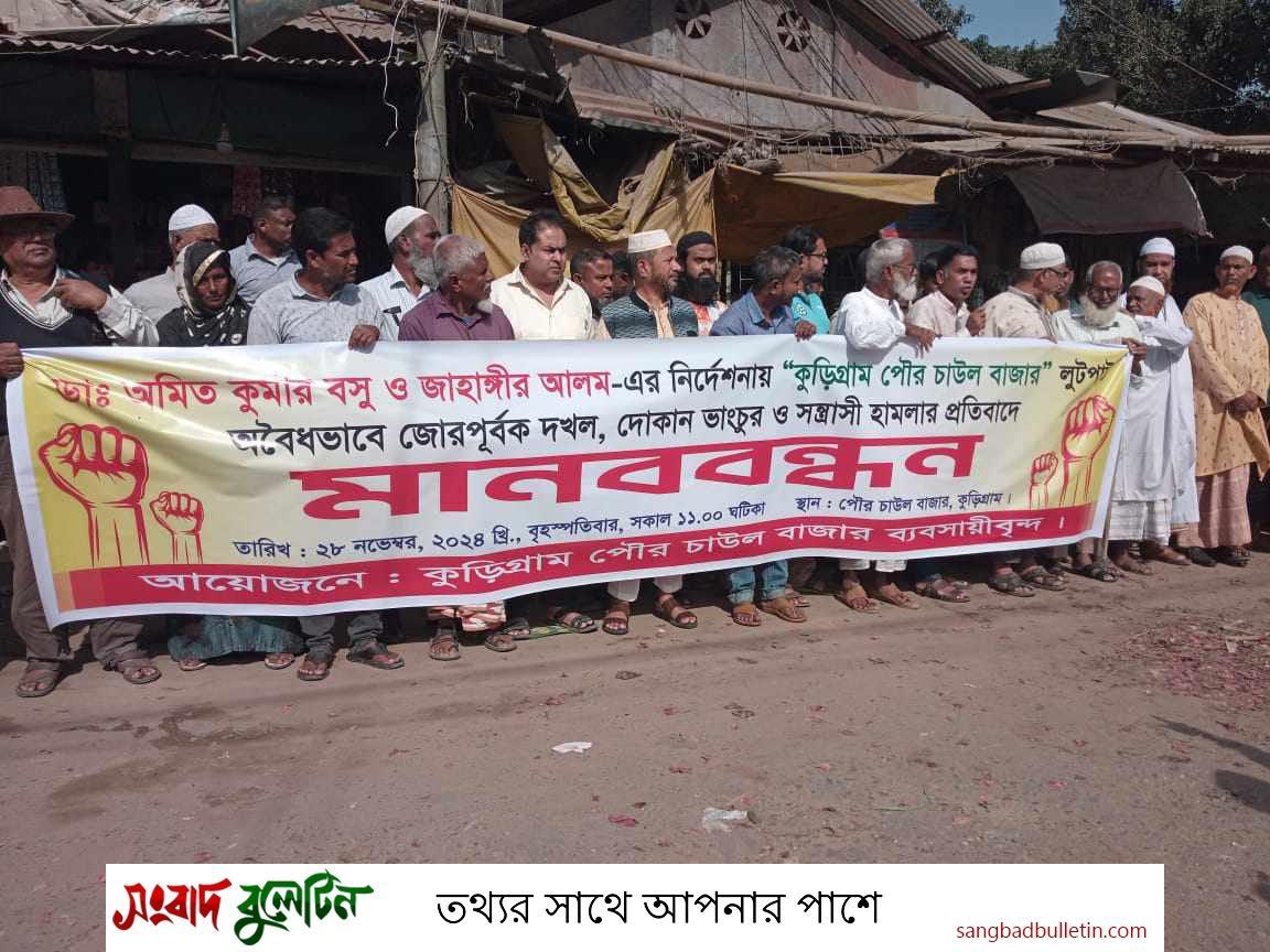 কুড়িগ্রামে ডাঃ অমিত কুমার বসুর বিরুদ্ধে পৌর চাউল বাজার ব্যবসায়ীদের মানববন্ধন