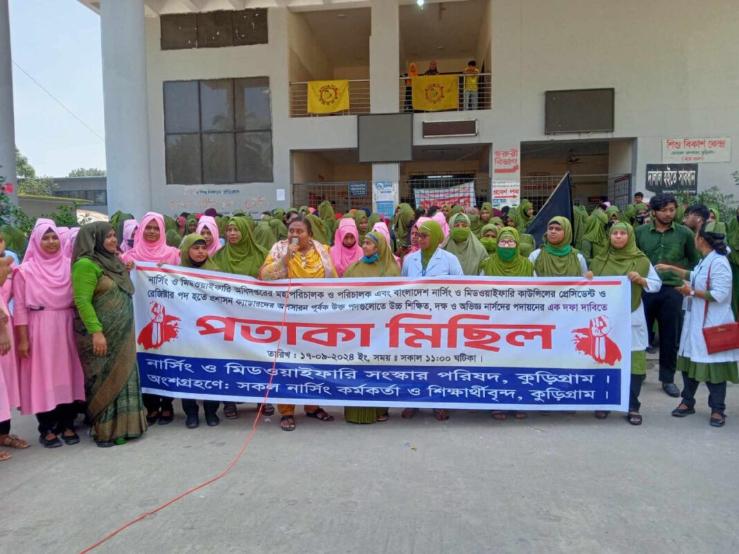 নার্সিং ও মিডওয়াইফারি অধিদপ্তরের মহাপরিচালক ও পরিচালক এবং বাংলাদেশ নার্সিং ও মিডওয়াইফারি কাউন্সিলের প্রেসিডেন্ট ও রেজিষ্টার পদ হতে প্রশাসন ক্যাডারদের অপসারণ পূর্বক উক্ত পদগুলোতে উচ্চ শিক্ষিত, দক্ষ ও অভিজ্ঞ নার্সদের পদায়নের এক দফা দাবিতে কুড়িগ্রামে কালো পতাকা মিছিল অনুষ্ঠিত হয়েছে।