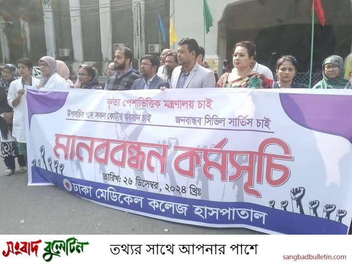 কৃত্য পেশাভিত্তিক মন্ত্রণালয় চাই, উপসচিব পদে সকল কোটার অবসান চাই, জনবান্ধন সিভিল সার্ভিস চাই, সংস্কারের নামে অসংস্কার বিসিএস স্বাস্থ্য ক্যাডার বিলুপ্তির অপচেষ্টা ও সরকারের উপসচিব পদে কোটা মানি না মানবো না স্লোগানে গাইবান্ধার ফুলছড়িতে আন্তঃক্যাডার বৈষম্য নিরসন পরিষদ ও বিসিএস স্বাস্থ্য ক্যাডার এসোসিয়েশন এর আয়োজনে এ মানববন্ধন অনুষ্ঠিত হয়েছে।