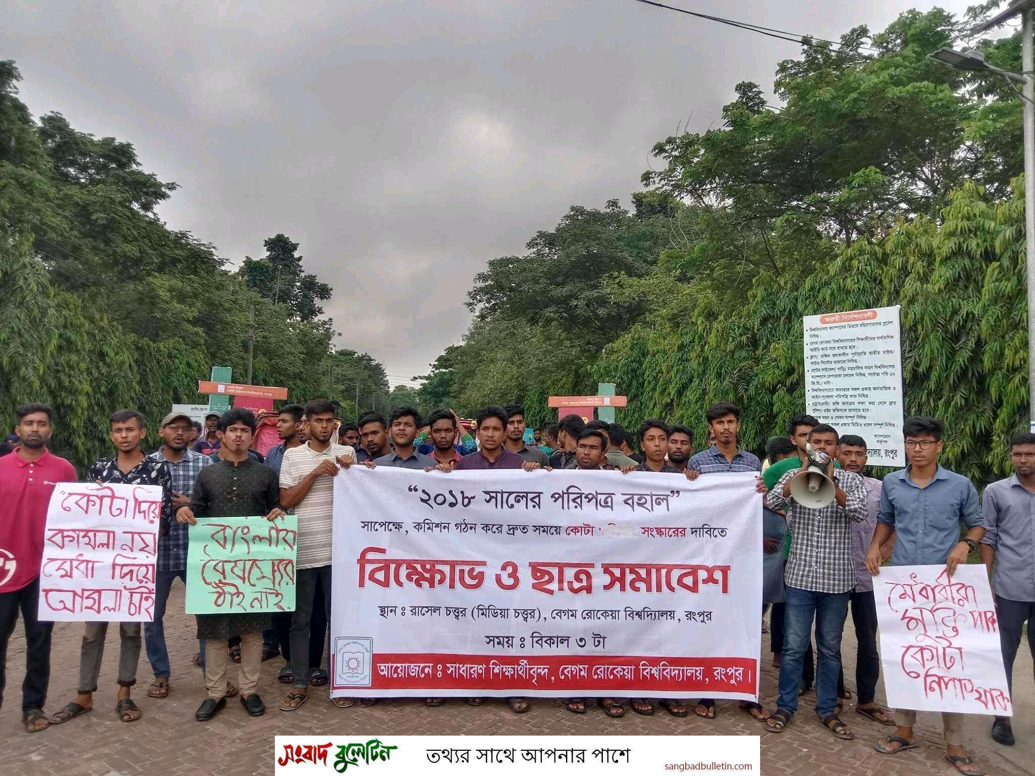 ২০১৮ সালের পরিপত্র বহাল"সাপেক্ষে কমিশন গঠন করে দ্রুত সময়ে কোটা সংস্কারের দাবিতে বিক্ষোভ ও ছাত্র সমাবেশ আয়োজন করে রংপুরের বেগম রোকেয়া বিশ্ববিদ্যালয়ের সাধারণ শিক্ষার্থীরা।
