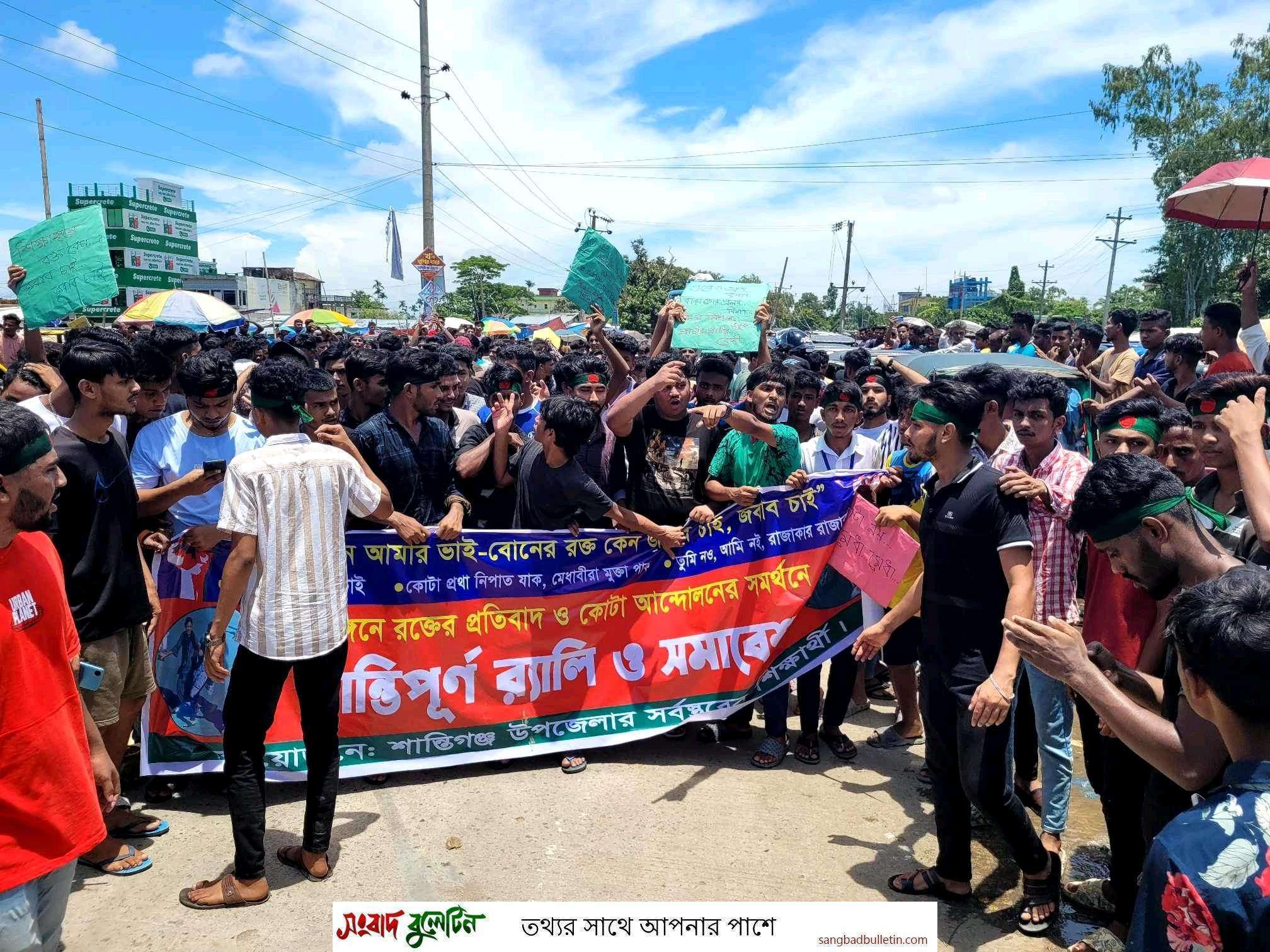 ঢাকায় কোটা সংস্কার আন্দোলনে শিক্ষার্থীদের উপর হামলা, সারা দেশে ছয়জনকে হত্যা ও কোটা সংস্কার আন্দোলনের সাথে সংহতি জানিয়ে উত্তপ্ত ছিল সুনামগঞ্জ জেলার শান্তিগঞ্জ উপজেলা সদর ও পাগলা বাজার এলাকা। শান্তিগঞ্জ বাজারে ছাত্রলীগ নেতাকর্মীদের সাথে তর্কাতর্কি ও ধস্তাধস্তি হয়েছে সাধারণ শিক্ষার্থীদের। আন্দোলন মিছিলের সময় শান্তিগঞ্জ বাজার ও পাগলা বাজার এলাকায় সিলেট-সুনামগঞ্জ আঞ্চলিক মহাসড়কে পৃথক পৃথকভাবে প্রায় দুই ঘন্টাব্যাপী সড়ক অবরোধ ছিলো। তখন অ্যাম্বুলেন্স ও রোগী বহনকারী যানবাহনকে নিজ দায়িত্বে রাস্তাপার করে দেয় সাধারণ শিক্ষার্থীরা।