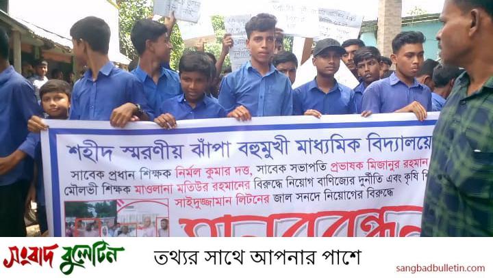 আজ ১০ সেপ্টেম্বর (মঙ্গলবার) শহীদ স্বরণী ঝাঁপা মাধ্যমিক বিদ্যালয়ে মানববন্ধনে সাবেক ও বর্তমান শিক্ষার্থীরা বলেন, বিদ্যালয়ের সাবেক প্রধান শিক্ষক নির্মল কুমার দত্ত, সভাপতি মিজানুর,মৌলবী শিক্ষক মতিয়ার রহমান ও শিক্ষক সাইদুজ্জামান লিটন সহ বেশ কয়েকজন শিক্ষক বিদ্যালয়ের নিয়োগ বাণিজ্য সহ সকল প্রকার দূর্নীতি ও অনিয়মের সাথে জর্জরিত।