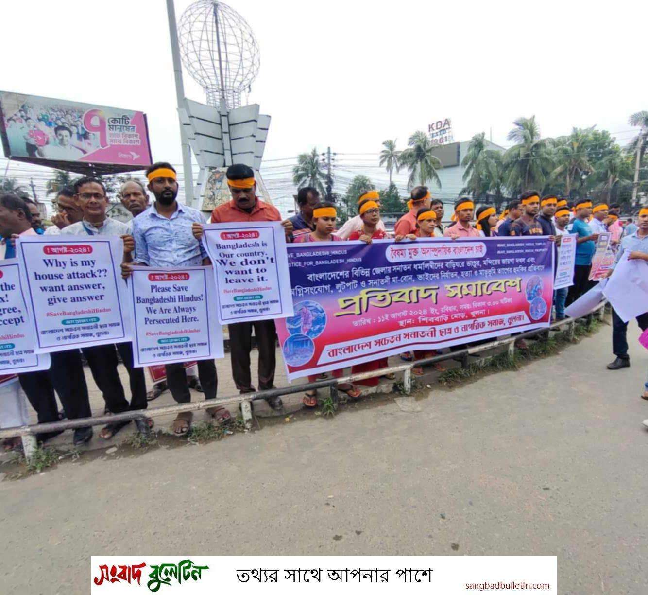 নিজস্ব প্রতিবেদক :দেশের বিভিন্ন স্থানে সনাতন ধর্মাবলম্বীদের উপর হামলা-নির্যাতন, মন্দির-মঠ, ঘরবাড়ি ভাঙচুর ও অগ্নিসংযোগের অভিযোগে খুলনায় প্রতিবাদ সমাবেশ করেছে সনাতন ধর্মাবলম্বীরা।