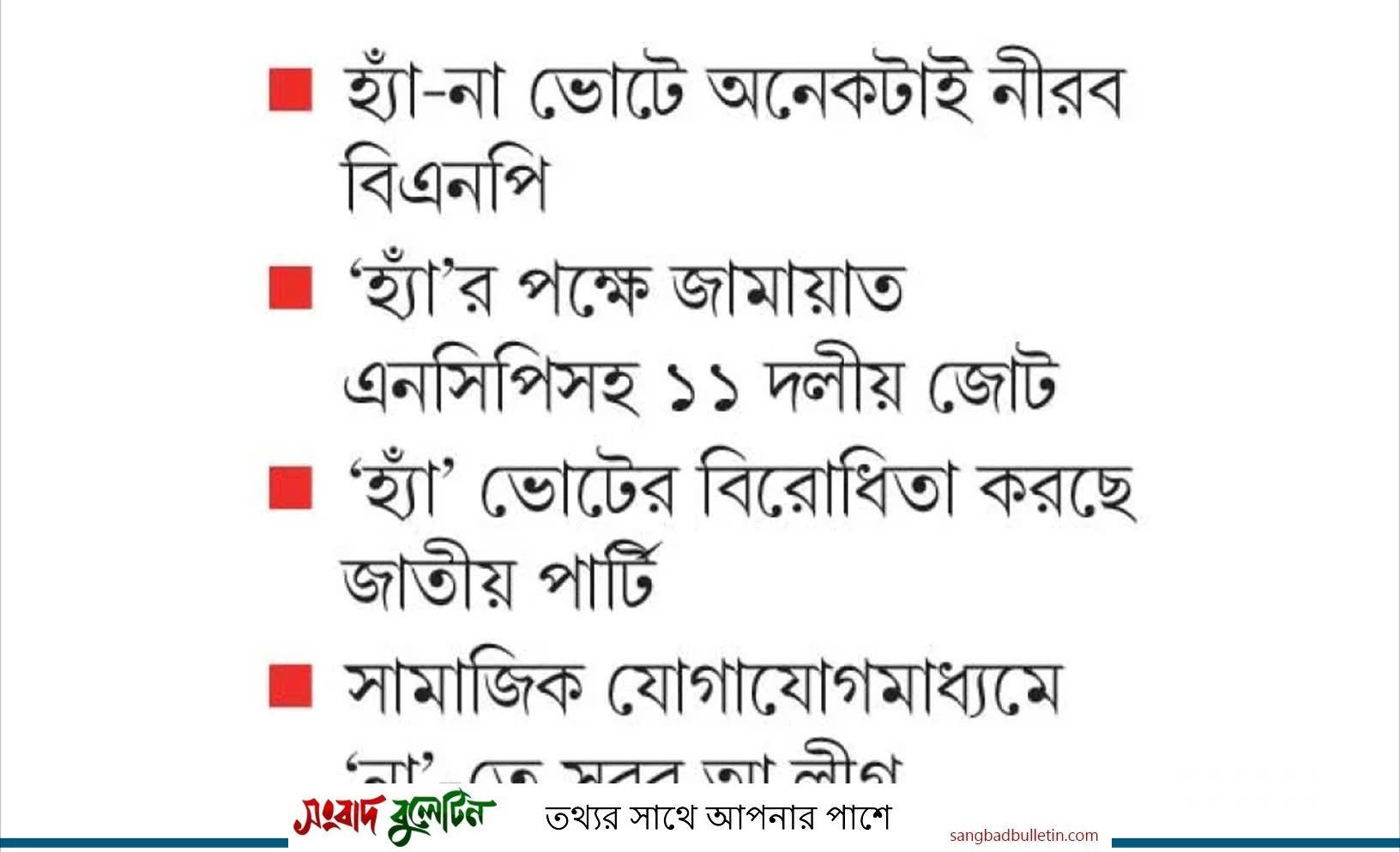 এবার গণভোটে ‘হ্যাঁ’-এর পক্ষে সরকার। সরকারের সঙ্গে হ্যাঁ-এর পক্ষে জামায়েতে ইসলামী-এনসিপিসহ ১১ দলীয় জোট প্রচার-প্রচারণা চালাচ্ছে। এক্ষেত্রে অনেকটা কৌশলী বিএনপি। তারা বিষয়টি নেতাকর্মীদের ওপর ছেড়ে দিয়েছে। আর গণভোটে ‘হ্যাঁ’র বিরোধিতা করছে জাতীয় পার্টি এবং কার্যক্রম নিষিধ আওয়ামী লীগ।