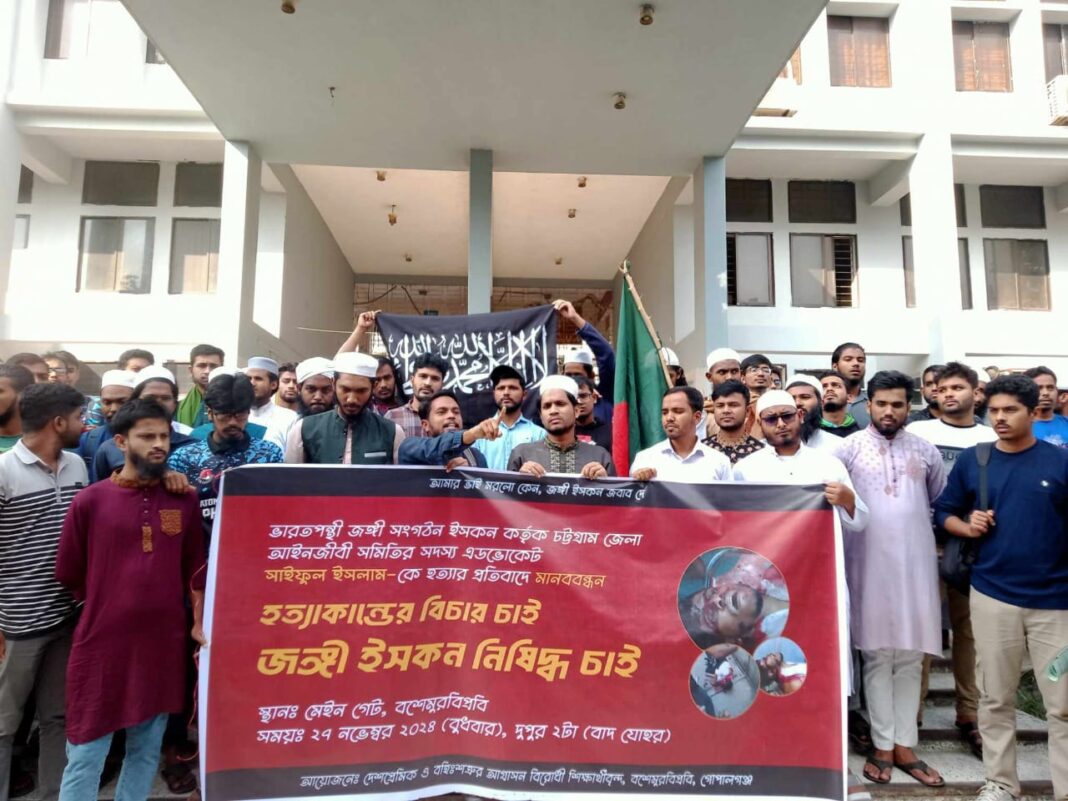 চট্টগ্রামে পুলিশের সঙ্গে বাংলাদেশ সম্মিলিত সনাতনী জাগরণ জোটের মুখপাত্র চিন্ময় কৃষ্ণ দাস ব্রহ্মচারীর অনুসারীদের সংঘর্ষের সময় হামলা চালিয়ে চট্টগ্রাম জেলা আইনজীবী সমিতির সদস্য অ্যাডভোকেট সাইফুল ইসলাম আলিফকে কুপিয়ে হত্যা করার ঘটনায় বিক্ষোভ ও প্রতিবাদ সমাবেশ করেছেন গোপালগঞ্জের বঙ্গবন্ধু শেখ মুজিবুর রহমান বিজ্ঞান ও প্রযুক্তি বিশ্ববিদ্যালয়ের (বশেমুরবিপ্রবি) সাধারণ শিক্ষার্থীরা। এ সময় তারা ঘটনায় জড়িত চিন্ময় কৃষ্ণ দাসের অনুসারীদের গ্রেপ্তার ও ইসকনকে বাংলাদেশে নিষিদ্ধ করার দাবি জানান।