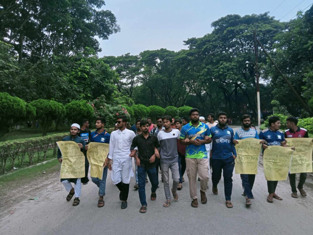 এ সময় শিক্ষার্থীদের হাতে ‘জঙ্গি সংগঠন ছাত্রলীগকে নিষিদ্ধ করতে হবে’, ‘মানবতাবিরোধী আওয়ামী লীগকে নিষিদ্ধ করতে হবে’, ‘দালাল বিচারপতিদের অপসারণ করতে হবে’ ইত্যাদি লেখা প্ল্যাকার্ড দেখা যায়।