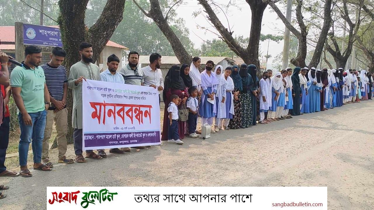 মানববন্ধনে বক্তারা বলেন, আমাদের শিক্ষা প্রতিষ্ঠানের সামনে সুনামগঞ্জ—জগন্নাথপুর—ঢাকা আঞ্চলিক মহাসড়ক। প্রতিদিন শত শত ছোট—বড় গাড়ি এই সড়কে চলাচল করছে। আমাদের শিক্ষা প্রতিষ্ঠানের শিক্ষার্থীরা জীবন ঝুঁকি নিয়ে এই সড়কপথে আসা—যাওয়া করে। এই সড়কপথে শুক্রবার নাদামপুর গ্রামের সামনে এক যুবক দুর্ঘটনায় প্রাণ হারিয়েছে। এতে আমাদের কোমলমতি শিক্ষার্থীরা আতঙ্কে আছে। আমরা অনতিবিলম্বে আমাদের শাহপরান মডেল হাই স্কুল ও মোশাররফ আলী ফ্রি— ক্যাডেট স্কুলের সামনে উভয় পাশে স্পিড ব্রেকার স্থাপনের করার জন্য কর্তৃপক্ষের নিকট দাবি জানাই।