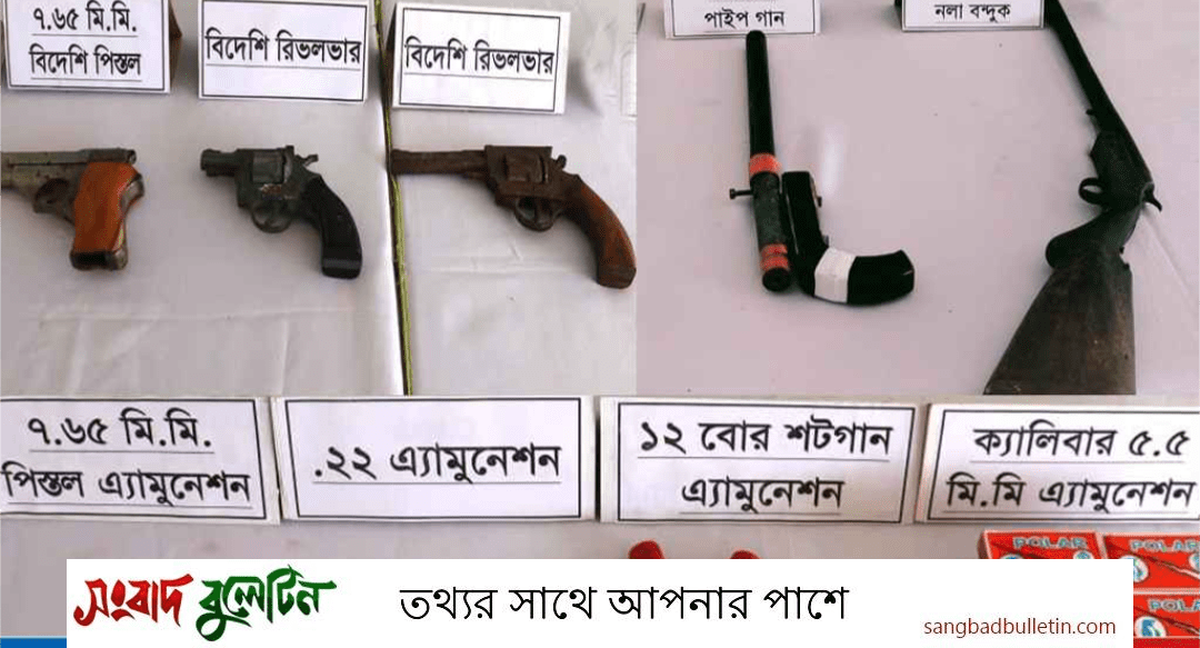 অভিযানের সময় একটি বিদেশি পিস্তল, দুইটি বিদেশি রিভলভার, একটি একনলা বন্দুক, একটি দেশীয় পাইপগান, বিভিন্ন ধরনের ১৩ রাউন্ড গুলি, ১৪ বক্স ক্যালিবারের এয়ারগানের গুলি ও একটি খালি ম্যাগাজিন পিস্তলসহ দেশে তৈরি বিভিন্ন প্রাণঘাতী ধারালো অস্ত্র উদ্ধার করা হয়েছে। পরে উদ্ধারকৃত অস্ত্র ও গোলাবারুদ থানা পুলিশের কাছে হস্তান্তর করা হয়।বিষয়টি নিশ্চিত করে জগন্নাথপুর থানার ভারপ্রাপ্ত কর্মকর্তা (ওসি) শফিকুল ইসলাম বলেন, এ ঘটনায় বুধবার পুলিশ বাদী হয়ে পিয়ার আলীর বিরুদ্ধে মামলা রুজু করা হয়েছে। ঘটনার পর থেকে পিয়ার আলী পলাতক রয়েছে। তবে তাকে গ্রেপ্তারে পুলিশ কাজ করে যাচ্ছে। সূত্র: Rtv