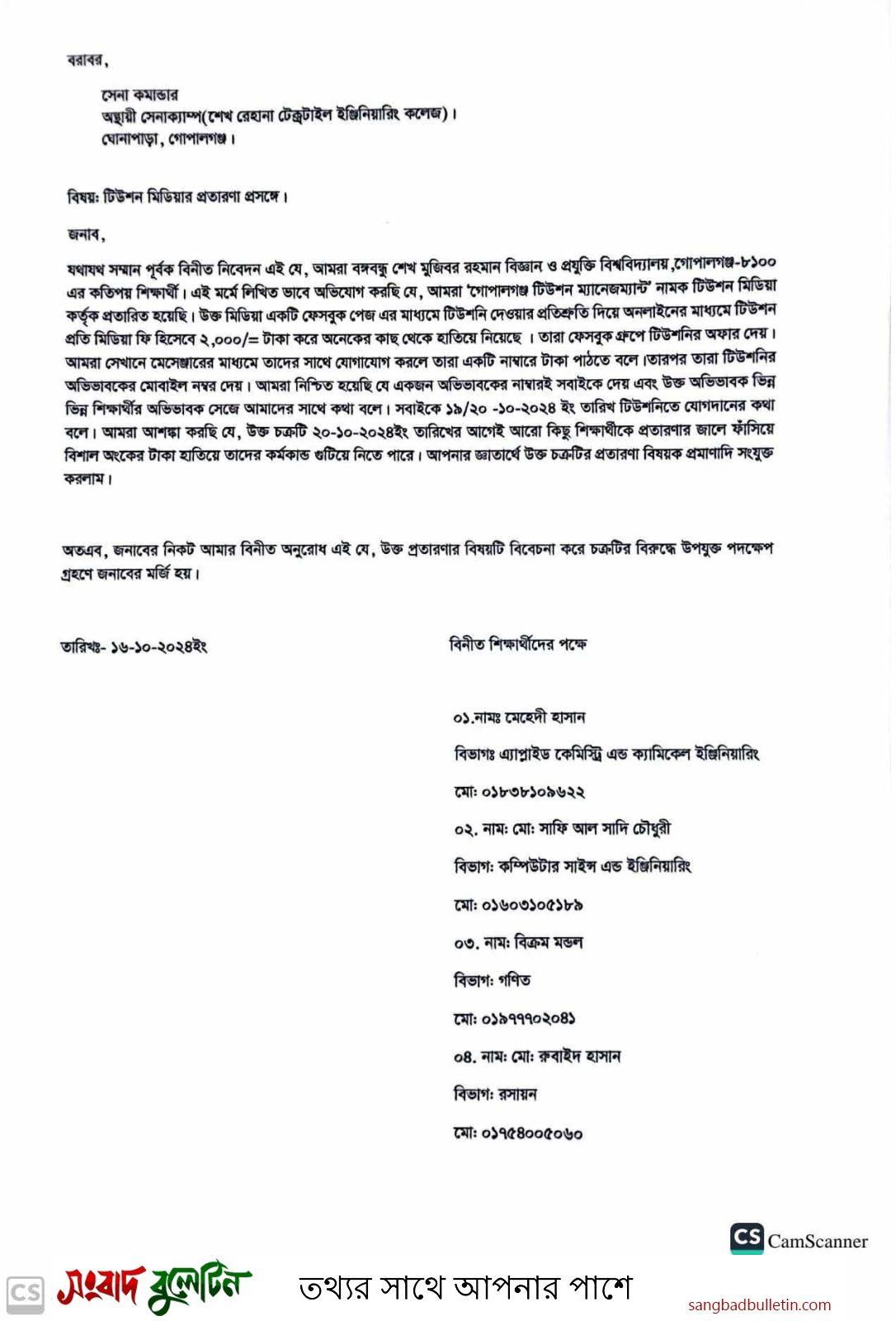 গোপালগঞ্জের বঙ্গবন্ধু শেখ মুজিবুর রহমান বিজ্ঞান ও প্রযুক্তি বিশ্ববিদ্যালয়ের (বশেমুরবিপ্রবিসাস) প্রায় ২০ এর অধিক শিক্ষার্থীদের কাছ থেকে অন্তত ৪০ হাজার টাকা হাতিয়ে নেওয়ার অভিযোগ উঠেছে ‘গোপালগঞ্জ টিউশনি ম্যানেজমেন্ট’ এর বিরুদ্ধে। এ নিয়ে পুলিশ প্রশাসনের কাছে এবং সেনা কমান্ডার বরাবর লিখিত অভিযোগ জানালে প্রতারক চক্রটি অফিস বন্ধ করে লেজ গুটিয়ে পালিয়েছে এই প্রতারক চক্র।
