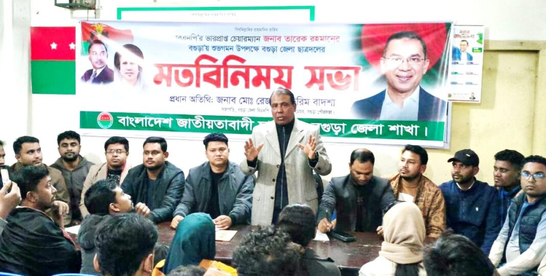 বাংলাদেশ জাতীয়তাবাদী দল বিএনপির ভারপ্রাপ্ত চেয়ারম্যান তারেক রহমানের বগুড়া আগমনকে কেন্দ্র করে তৎপর হয়ে উঠেছে বগুড়া জেলা ছাত্রদল। এই উপলক্ষে সংগঠনের পক্ষ থেকে এক গুরুত্বপূর্ণ মতবিনিময় সভা অনুষ্ঠিত হয়েছে।