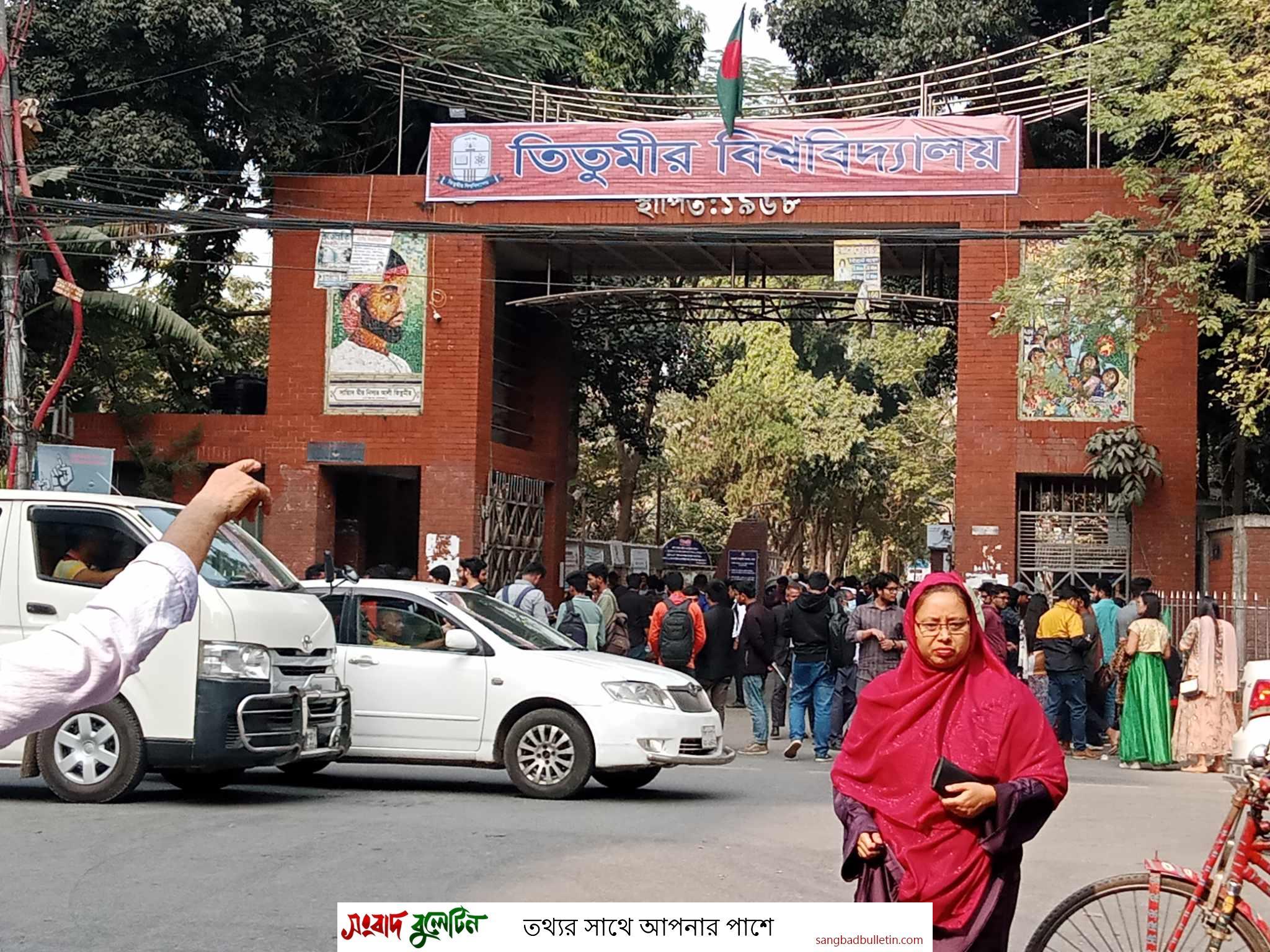 তিতুমীর কলেজের মূল গেইটে বিশ্ববিদ্যালয় লেখা ব্যানার ঝুলানো শিক্ষার্থীরা