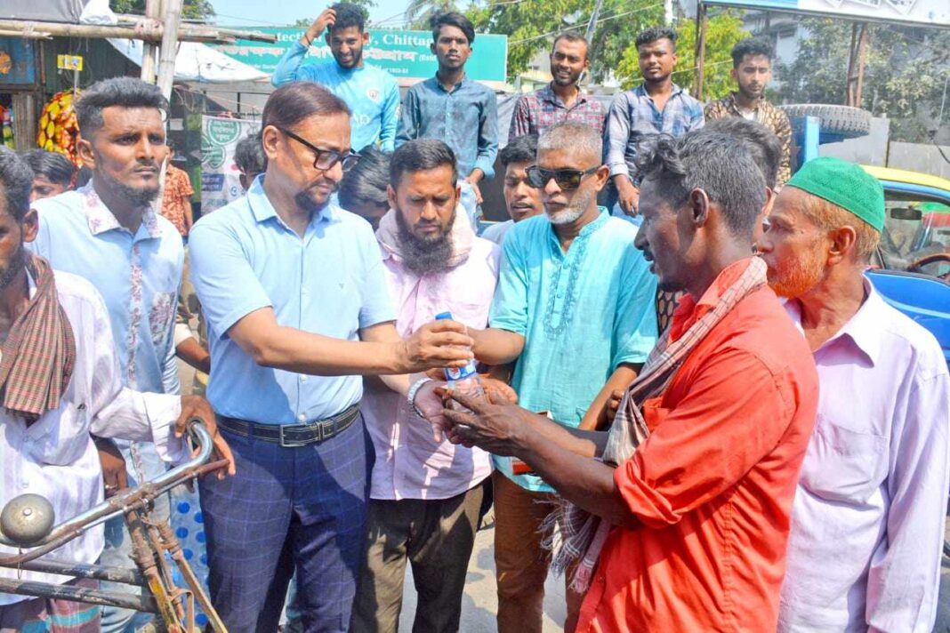 চট্টগ্রামে খাবার পানি ও স্যালাইন বিতরণকালে ডা. শাহাদাত হোসেন