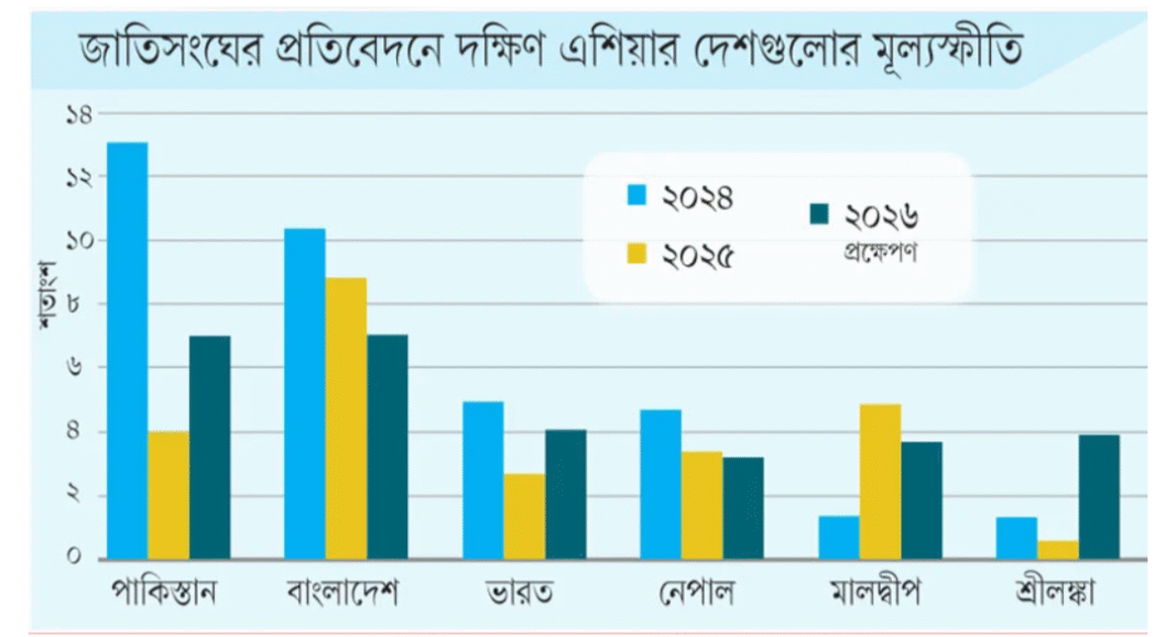 বাংলাদেশের মূল্যস্ফীতি কিছুটা কমলেও চাপ পুরো কাটেনি বলে মন্তব্য জাতিসংঘের। প্রতিবেদন অনুযায়ী দক্ষিণ এশিয়ায় ২০২৫ সালে মূল্যস্ফীতি উল্লেখযোগ্যভাবে কমেছে। তবে বাংলাদেশের ক্ষেত্রে মূল্যস্ফীতি এখনও তুলনামূলক বেশি। মূল্যস্ফীতিকে বাগে আনতে আইএমএফের পরামর্শ মেনে বাংলাদেশ ব্যাংক কঠোর মুদ্রানীতি বজায় রেখেছে; যেখানে ভারত, পাকিস্তান ও শ্রীলঙ্কা সুদের হার কমাতে শুরু করেছে। জাতিসংঘের মতে, খাদ্যপণ্য ও আমদানিনির্ভর জ্বালানির দামের ঝুঁকি বাংলাদেশের মূল্যস্ফীতি পুরোপুরি নিয়ন্ত্রণে আসার পথে প্রধান বাধা।