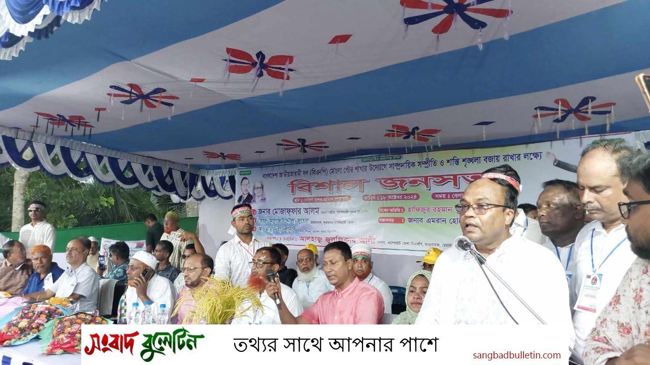 মো: হাছিব সরদার, মোংলা সংবাদদাতা: বাংলাদেশের সাবেক প্রধানমন্ত্রী স্বৈরাচার ফ্যাসিস্ট হাসিনা সরকারের পদত্যাগের পর দীর্ঘ ১৮ বছর পরে মোংলায় বিএনপি'র জনসভা অনুষ্ঠিত হয়েছে। বাংলাদেশ জাতীয়তাবাদী দল (বিএনপি) মোংলা পৌর শাখার উদ্যোগে সাম্প্রদায়িক সম্প্রীতি ও শান্তি-শৃঙ্খলা বজায় রাখার লক্ষ্যে এ জনসভা অনুষ্ঠিত হয়।