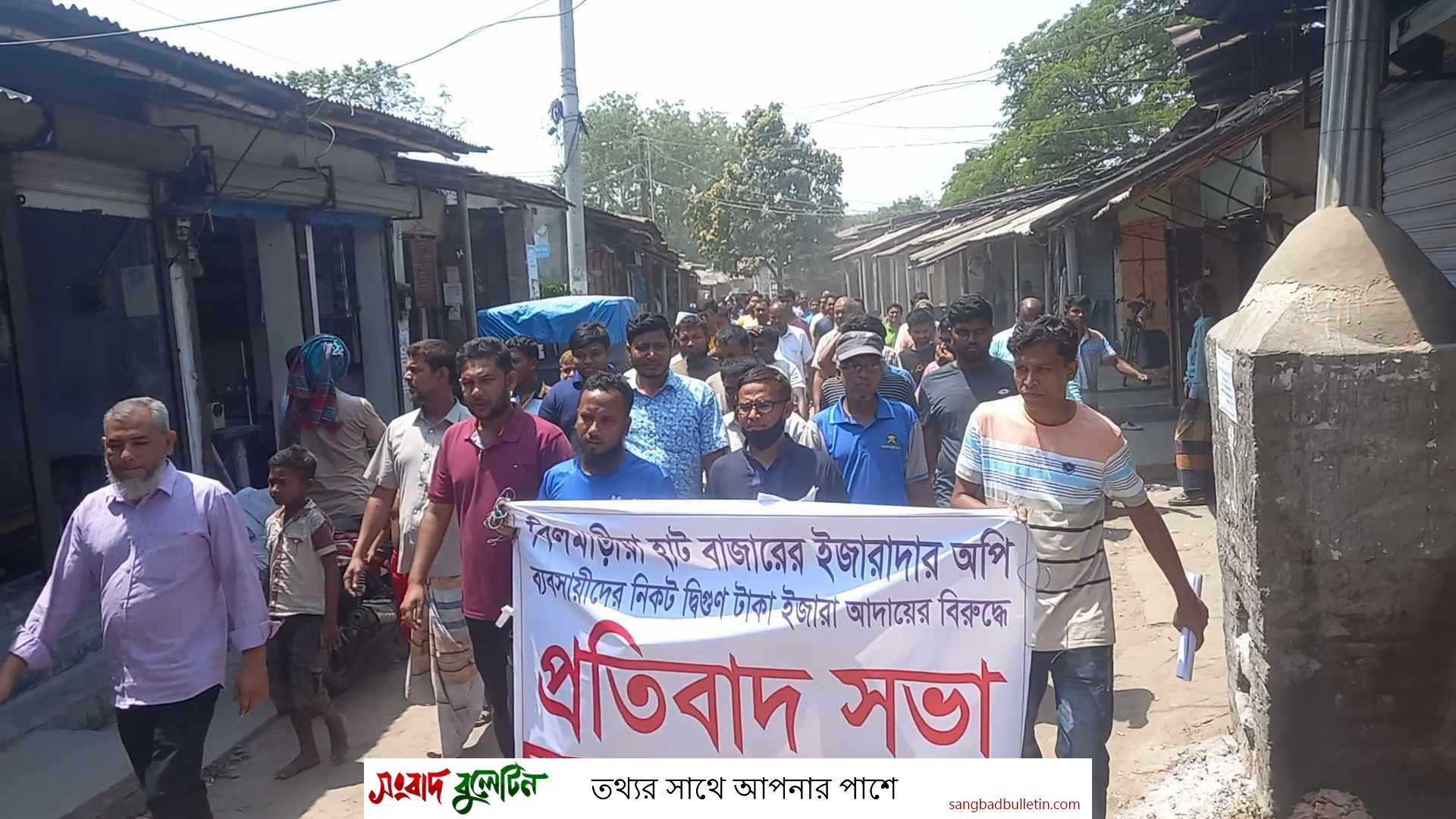 নাটোরের লালপুর উপজেলার বিলমাড়িয়া বাজারে অতিরিক্ত খাজনা আদায় ও দুই ব্যবসায়ীকে মারধরের অভিযোগে দোকান বন্ধ রেখে বিক্ষোভ মিছিল ও প্রতিবাদ সমাবেশ করেছে ব্যবসায়ীরা। বুধবার (১৭এপ্রিল) সকাল সাড়ে ১১ টার দিকে বিলমাড়িয়া হাট বাজার ব্যবসায়ী সমিতির উদ্যোগে একর্মসূচি পালন করা হয়। এঘটনায় অতিরিক্ত খাজনা আদায় বন্ধে লালপুর উপজেলা নির্বাহী কর্মকর্তার কাছে লিখিত অভিযোগ দিয়েছেন তারা।