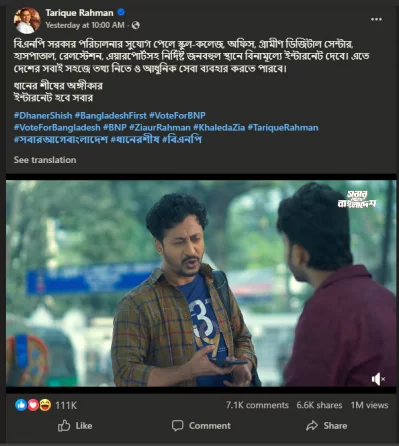 ভিডিওর ক্যাপশনে তারেক রহমান লেখেন, ‘বিএনপি সরকার পরিচালনার সুযোগ পেলে স্কুল-কলেজ, অফিস, গ্রামীণ ডিজিটাল সেন্টার, হাসপাতাল, রেলস্টেশন, এয়ারপোর্টসহ নির্দিষ্ট জনবহুল স্থানে বিনামূল্যে ইন্টারনেট দেবে। এতে দেশের সবাই সহজে তথ্য নিতে ও আধুনিক সেবা ব্যবহার করতে পারবে।
