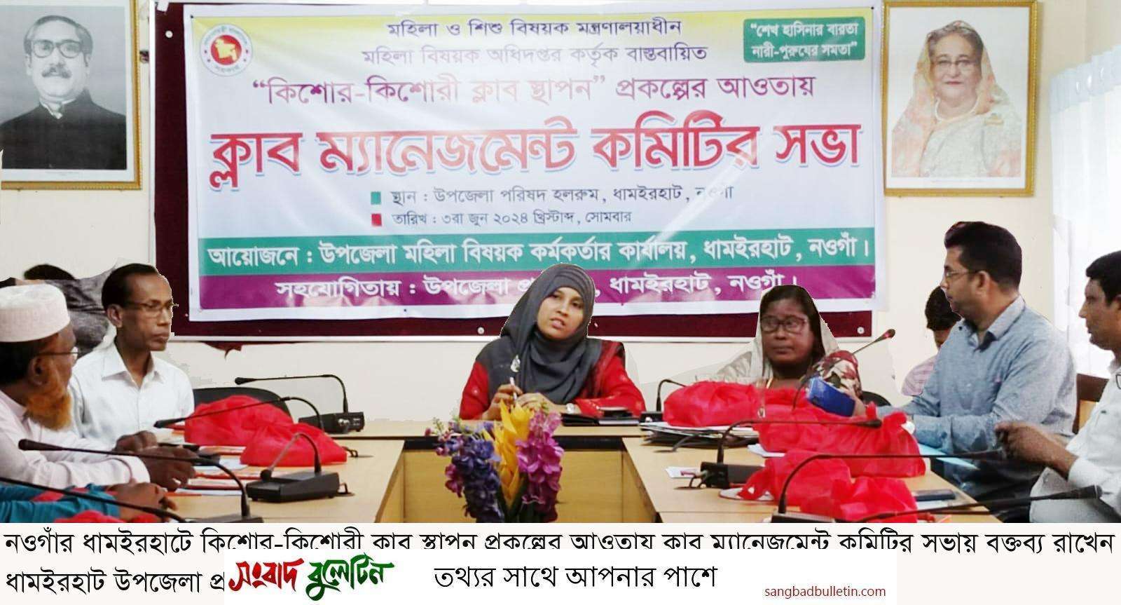 নওগাঁর ধামইরহাটে মহিলা বিষয়ক অধিদপ্তর কর্তৃক বাস্তবায়িত কিশোর-কিশোরী ক্লাব স্থাপন প্রকল্পের আওতায় ক্লাব ম্যানেজমেন্ট কমিটি (সিএমসি)’র সভা অনুষ্ঠিত হয়েছে। উপজেলা মহিলা বিষয়ক অধিদপ্তরের আয়োজনে ও উপজেলা প্রশাসনের সহযোগিতায় ইউএনও আসমা খাতুনের সভাপতিত্বে সিএমসি কমিটির সভা গতকাল বেলা ১১ টায় পরিষদের সভা কক্ষে অনুষ্ঠিত হয়। উপজেলা মহিলা বিষয়ক কর্মকর্তা মিজানুর রহমানের সঞ্চালনায় সভায় বক্তব্য রাখেন উপজেলা মহিলা ভাইস চেয়ারম্যান ও মহিলা আওয়ামীলীগের সভানেত্রী আনজুয়ারা বেগম, উপজেলা একাডেমিক সুপার ভাইজার কাজল কুমার সরকার, ভারপ্রাপ্ত সমাজসেবা অফিসার এ.টি.এম ফসিউল আলম, ইউপি চেয়ারম্যান এ.টি.এম বদিউল আলম, জাহানপুর ইউপি চেয়ারম্যান গোলাম কিবরিয়া, আগ্রাদ্বিগুন ইউপি চেয়ারম্যান ইসমাইল হোসেন মোস্তাক, সফিয়া পাইলট উচ্চ বিদ্যালয়ের প্রধান শিক্ষক আব্দুর রহমান সাবু, হরিতকীডাঙ্গা উচ্চ বিদ্যালয়ের প্রধান শিক্ষক মোসা. উম্মে কুলসুম, জেন্ডার প্রমোটার মনিরা বেগম, জেসমিন আকতার প্রমুখ। সভায় ক্লাবের বিভিন্ন সমস্যা সমাধানে ও কিশোর-কিশোরী ক্লাবে শিক্ষার্থীদের উপস্থিতি বিষয়ে জেন্ডার প্রমোটারদের কমিটির পক্ষ থেকে আহবান জানানো হয়।