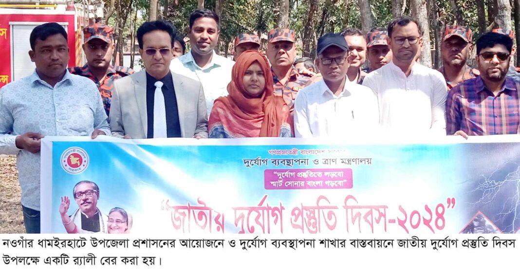 নওগাঁর ধামইরহাটে দুর্যোগ প্রস্তুতি দিবস পালিত হয়েছে। ধামইরহাট উপজেলা প্রশাসনের আয়োজনে ওয়ার্ল্ড ভিশন ধামইরহাট এপি’র সহযোগিতায় এবং দুর্যোগ ব্যবস্থাপনা শাখার বাস্তবায়নে ১০ মার্চ বেলা ১১ টায় ধামইরহাট মহিলা ডিগ্রী কলেজ মাঠে দিবসটি উপলক্ষে র‌্যালি, আলোচনা সভা এবং অগ্নিকা- ও ভূমিকম্প থেকে উদ্ধারের মহড়া চালানো হয়। মহড়া পরিচালনা করেন ফায়ার সার্ভিসের স্টেশন লিডার শফিকুল ইসলাম। সহকারী কমিশনার (ভূমি) মোসা. জেসমিন আকতারের সভাপতিত্বে আলোচনা সভায় অংশগ্রহণ করেন ধামইরহাট উপজেলা পরিষদের ভাইস চেয়ারম্যান মো. সোহেল রানা, মাধ্যমিক শিক্ষা অফিসার শেখ আব্দুল্লাহ আল মামুন উপজেলা শিক্ষা অফিসার রবিউল ইসলাম, প্রকল্প বাস্তবায়ন কর্মকর্তা মনছুর আলী, মহিলা কলেজের ভারপ্রাপ্ত অধ্যক্ষ হানিফুল ইসলাম, জনস্বাস্থ্য প্রকৌশল দপ্তরের সহকারী প্রকৌশলী মিলন কুমার, প্যানেল মেয়র মেহেদী হাসান, ফায়ার সার্ভিস স্টেশন অফিসার শামসুল আলম,ওয়ার্ল্ড ভিশন প্রজেক্ট অফিসার মুকুুল বৈরাগী, প্রভাষক আব্দুর রাজ্জাকসহ কলেজের অন্যান্য শিক্ষকবৃন্দ। অনুষ্ঠানে অগ্নিকান্ডে করনীয় ও গ্যাস সিলিন্ডারে আগুন নিয়ন্ত্রন কৌশল শেখানো হয়।