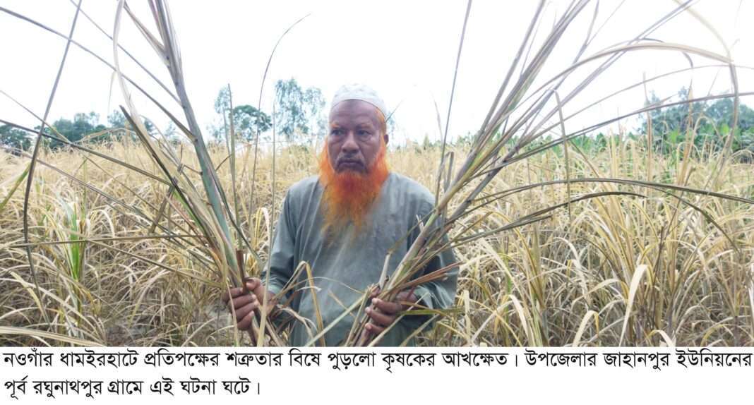 নওগাঁর ধামইরহাটে প্রতিপক্ষের শত্রুতার বিষে পুড়লো কৃষকের আখক্ষেত। ক্ষতিকারক কীটনাশক স্প্রে করে ১ একর জমির সম্পূর্ণ আখ বিনষ্ট হয়ে গেছে। ভুক্তভোগী আব্দুল মান্নানের ছেলে শফিউল ইসলাম ন্যায় বিচারের আশায় ধামইরহাট থানায় একটি অভিযোগ দায়ের করেন।