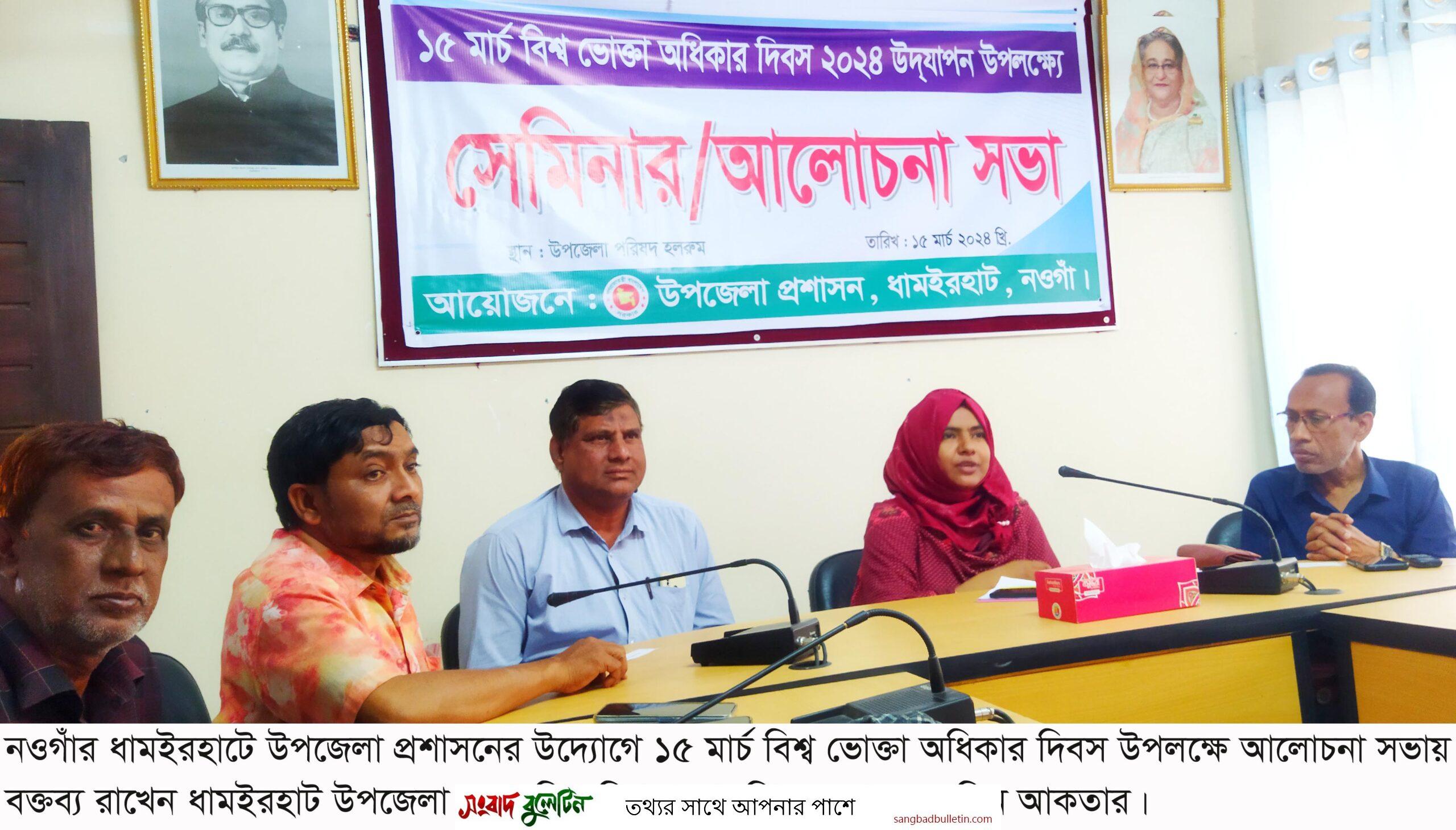 ধামইরহাট (নওগাঁ) প্রতিনিধি- নওগাঁর ধামইরহাটে ভোক্তা অধিকার দিবস উদযাপন করা হয়েছে। ধামইরহাট উপজেলা প্রশাসনের আয়োজনে দিবসটি উদযাপন উপলক্ষে ১৫ মার্চ ১০ টায় উপজেলা পরিষদ মিলনায়তনে আলোচনা সভা অনুষ্ঠিত হয়। আলোচনা সভায় সভাপতিত্ব করেন সহকারি কমিশনার (ভূমি) মোসা. জেসমিন আকতার। আলোচনা সভায় বক্তব্য রাখেন উপজেলা খাদ্য নিয়ন্ত্রক মামুনুর রশিদ, স্যানিটারী ইন্সপেক্টর মো. আনিসুর রহমান, ভারপ্রাপ্ত সমাজ সেবা কর্মকর্তা এ টি এম ফসিউল আলম, জাহানপুর ইউপি চেয়ারম্যান গোলাম কিবরিয়া, পরিবার পরিকল্পনা দপ্তরের প্রতিনিধি গোলাম সরফরাজ রাঙ্গা, ধামইরহাট কেজি স্কুলের অধ্যক্ষ আব্দুল বারিক, সাংবাদিক এম এ মালেক, আবু মুছা স্বপন প্রমুখ। বাজারে রাস্তার পাশে খোলা ইফতারি সামগ্রী বিক্রয় নিয়ন্ত্রণ, উচ্চ মূল্যে খেজুর, আপেল, মাল্টা, পচা মাছ, কেমিক্যাল বা রং মিশ্রিত জিলাপি, বিস্কুট, চানাচুর, কেমিক্যাল যুক্ত আচার, ঘরে তৈরি অস্বাস্থ্যকর জুস ইত্যাদি খাদ্যপণ্য বাজারজাত নিয়ন্ত্রণ ও প্রয়োজনে মোবাইল কোর্ট পরিচালনা সিদ্ধান্ত গৃহীত হয়। সহকারী কমিশনার (ভূমি) ও নির্বাহী ম্যাজিস্ট্রেট জেসমিন আকতার অঙ্গীকার করেন- ‘ভোক্তা অধিকার সুরক্ষায় শতভাগ দায়িত্ব পালন করব।’ এছাড়াও তিনি জনসচেতনতা সৃষ্টির জন্য বিভিন্ন দপ্তরের কর্মকর্তা এবং ইউপি চেয়ারম্যান-মেম্বারদের ভূমিকা পালনের অনুরোধ জানান।
