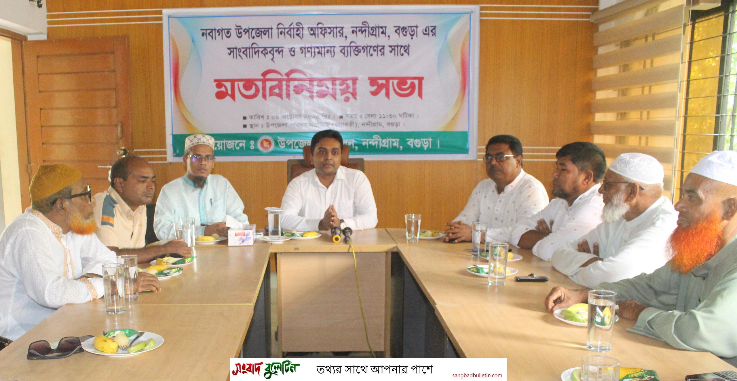নন্দীগ্রাম (বগুড়া) প্রতিনিধি: বগুড়ার নন্দীগ্রামে নবাগত উপজেলা নির্বাহী অফিসার (ইউএনও) মোঃ আরিফুল ইসলামের সঙ্গে স্থানীয় সাংবাদিক ও গণ্যমান্য ব্যক্তিদের অংশগ্রহণে এক মতবিনিময় সভা অনুষ্ঠিত হয়েছে।