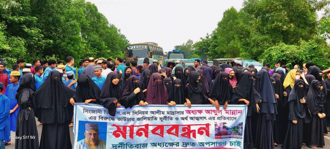 নন্দীগ্রামে মাদ্রাসা অধ্যক্ষকে অপসারণের দাবিতে মহাসড়ক অবরোধ করে শিক্ষার্থীদের মানববন্ধন