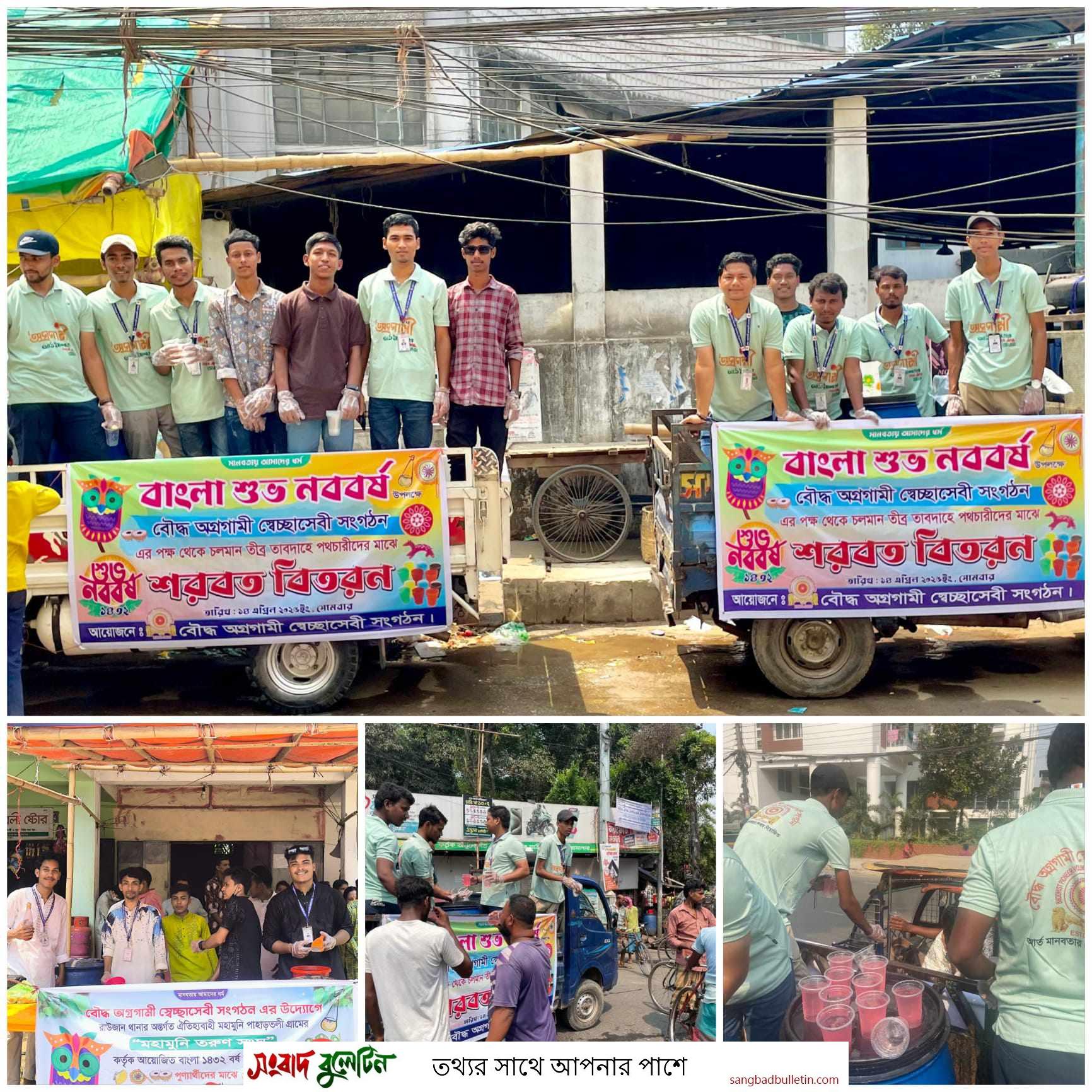 এই গরমে যখন রোদ আর ক্লান্তি মানুষকে কাবু করে ফেলেছে, ঠিক তখনই পহেলা বৈশাখ উপলক্ষে বৌদ্ধ অগ্রগামী স্বেচ্ছাসেবী সংগঠন এক প্রশংসনীয় মানবিক উদ্যোগ গ্রহণ করেছে। চট্টগ্রাম শহর ও মহামুনি পাহাড়তলী এলাকায় পথচারী ও সাধারণ মানুষের মাঝে বিনামূল্যে ঠাণ্ডা শরবত বিতরণ করা হয়।
