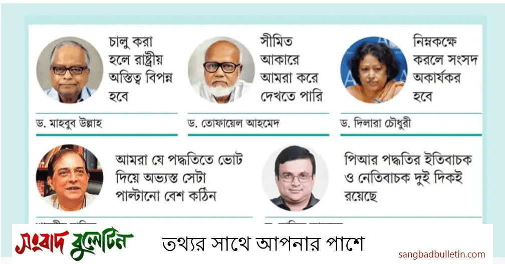 রাষ্ট্রবিজ্ঞানী অধ্যাপক ড. দিলারা চৌধুরী মনে করেন, ‘পিআর পদ্ধতির মাধ্যমে উচ্চকক্ষে নির্বাচন করা যেতে পারে। তবে এ জন্য উচ্চকক্ষের ক্ষমতা বাড়াতে হবে। নিম্নকক্ষে করলে সংসদ অকার্যকর হবে। কোনো কিছুতেই একমত হওয়া যাবে না। কারণ আমাদের দেশে অনেক দল, অনেক মত। আবার লোকাল লোকজন তো প্রার্থীদের সেভাবে চিনবে না।’