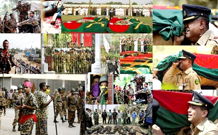 ১৫ বছর পূর্তি উপলক্ষে পিলখানা হত্যাকাণ্ডে শহিদদের প্রতি শ্রদ্ধা নিবেদন করা হয়েছে। রোববার সকাল ৯টা ৮ মিনিটে বনানীর সামরিক কবরস্থানে শহিদদের কবরে পুষ্পস্তবক অর্পণের মাধ্যমে শাহাদত বরণকারী সেনাকর্মকর্তাদের স্মৃতির প্রতি গভীর শ্রদ্ধা নিবেদন করা হয়।