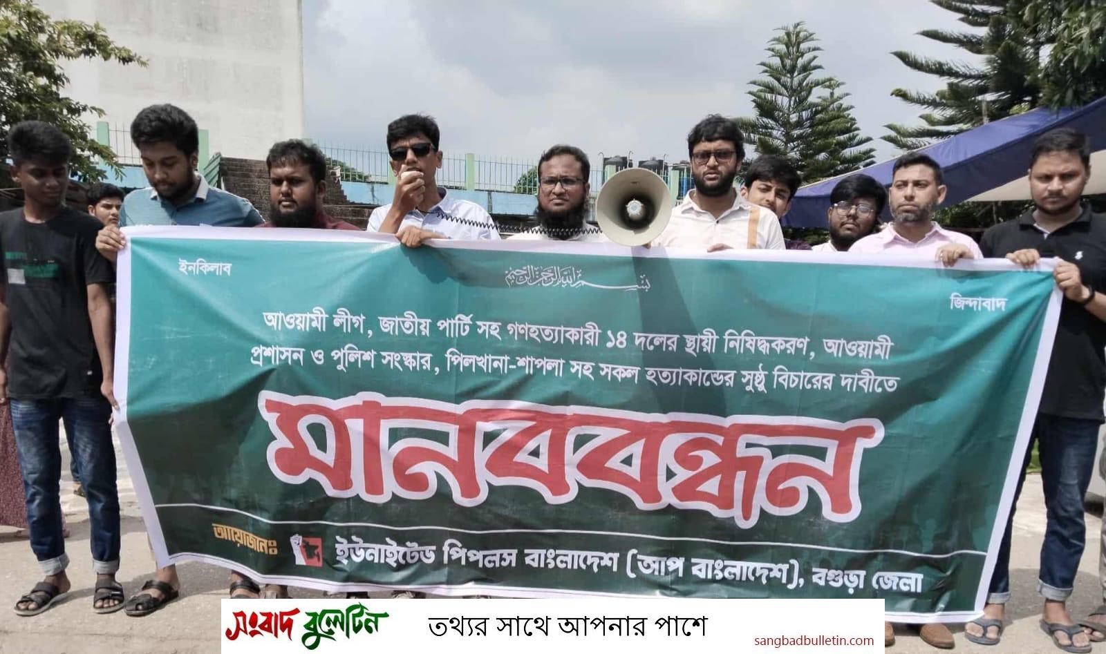 বগুড়ায় ফ্যাসিস্ট আওয়ামী লীগ, জাতীয় পার্টি সহ গণহত্যাকারী ১৪ দল নিষিদ্ধের দাবীতে আপ বাংলাদেশের মানববন্ধন অনুষ্ঠিত