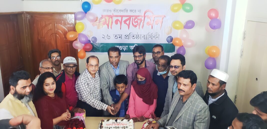 বাংলা ভাষায় প্রথম ট্যাবলয়েড দৈনিক মানবজমিন পত্রিকার ২৬ তম প্রতিষ্ঠাবার্ষিকী উপলক্ষে বগুড়ায় আলোচনা সভা ও কেককাটা অনুষ্ঠিত হয়েছে।