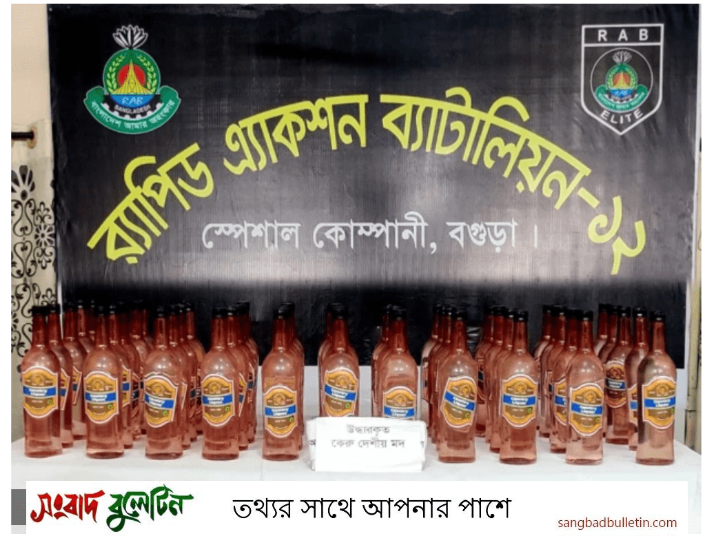 বগুড়ায় র্যাব-১২ এর মাদকবিরোধী অভিযানে ৫৫ বোতল কেরু মদ উদ্ধার করা হয়েছে। এসময় হাতেনাতে আটক হয়েছেন এক মাদক কারবারি। তার বিরুদ্ধে মাদকদ্রব্য নিয়ন্ত্রণ আইনে মামলা দায়ের করা হয়েছে।