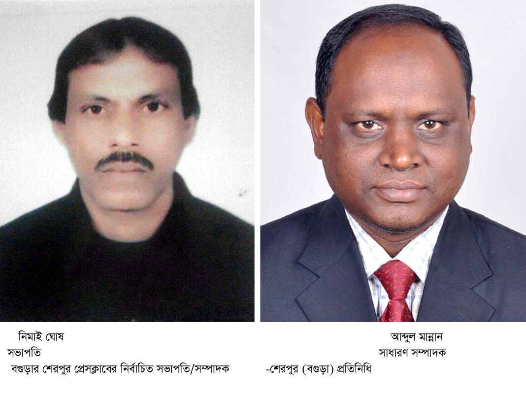 বগুড়ার শেরপুর প্রেসক্লাবের সভাপতি পদে নিমাই ঘোষ (দৈনিক সমকাল) ও সাধারণ সম্পাদক পদে আব্দুল মান্নান (দৈনিক ইত্তেফাক) পুনঃনির্বাচিত হয়েছেন। শনিবার (২৭ এপ্রিল) দুপুরে শহরের বাসস্ট্যান্ড এলাকায় সংগঠনের কার্যালয়ে আয়োজিত দ্বি-বার্ষিক সাধারণ সভায় সর্বসম্মতিক্রমে আগামি দুই বছরের জন্য নির্বাচিত হয়েছেনৃ তাঁরা। একইভাবে নির্বাচিত প্রেসক্লাবের কার্যনির্বাহি কমিটির অন্যরা হলেন-সহসভাপতি সবুজ চৌধুরী (প্রথম আলো), যুগ্ম সাধারণ সম্পাদক আইয়ুব আলী (দৈনিক কালেরকণ্ঠ), দপ্তর সম্পাদক আব্দুল ওয়াদুদ (আজকালের খবর), সাহিত্য সম্পাদক জাহিদ হাসান (দেশ রুপান্তর), কার্যনির্বাহী সদস্য সুজিত বসাক (সাপ্তাহিক তথ্যমালা), আকরাম হোসাইন (নয়াদিগন্ত), জাহাঙ্গীর ইসলাম (যুগান্তর), আব্দুল আলীম (মহাস্থান) ও শাহজামাল কামাল (ভোরের ডাক)। এরআগে ওই দ্বি-বার্ষিক সাধারণ সভায় বার্ষিক সাংগঠনিক ও আয়-ব্যয়ের প্রতিবেদন পেশ করা হয়। পরে আলোচনা-পর্যালোচনা শেষে প্রতিবেদনটি অনুমোদিত হয়। এরপর নতুন কার্যনির্বাহি কমিটি গঠনে দায়িত্ব পালন করেন সাপ্তাহিক আজকের শেরপুর পত্রিকার সম্পাদক আলহাজ¦ মুনসী সাইফুল বারী ডাবলু। শেষে সংগঠনের সদস্য আব্দুল আলীম ও আল ইমরান হজব্রত পালন উপলক্ষ্যে বিশেষ দোয়া মোনাজাত পরিচালিত হয়।