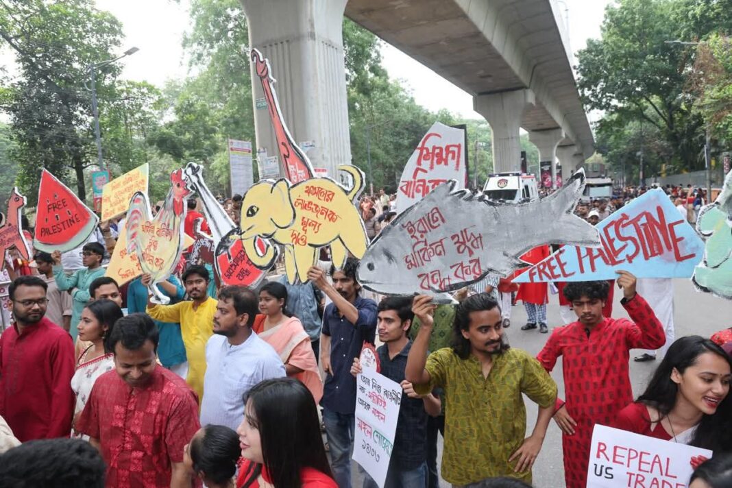 রাজধানী ঢাকায় বরাবরের মতোই বর্ষবরণের মূল আকর্ষণ হয়ে দাঁড়িয়েছে ঢাকা বিশ্ববিদ্যালয়ের চারুকলা অনুষদের আয়োজনে মঙ্গল শোভাযাত্রা। এবারের শোভাযাত্রায় ‘শান্তি, সৃজন, শান্তি, গৌরব ও গতিময়তা’র প্রতীক হিসেবে মোরগ, বেহালা, পায়রা, হাতি ও ঘোড়ার পাঁচটি বিশেষ মোটিফ স্থান পেয়েছে। রঙিন কাগজে নির্মিত বিশাল সব প্রতিকৃতি আর বাদ্যযন্ত্রের তালে মুখরিত এই শোভাযাত্রার মূল বার্তা হলো অশুভ শক্তির বিনাশ এবং কল্যাণময় আগামীর পথে যাত্রা।