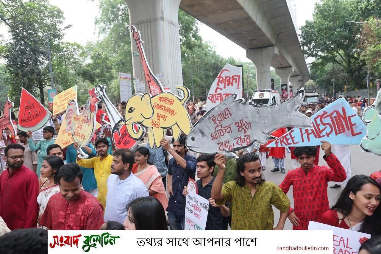 রাজধানী ঢাকায় বরাবরের মতোই বর্ষবরণের মূল আকর্ষণ হয়ে দাঁড়িয়েছে ঢাকা বিশ্ববিদ্যালয়ের চারুকলা অনুষদের আয়োজনে মঙ্গল শোভাযাত্রা। এবারের শোভাযাত্রায় ‘শান্তি, সৃজন, শান্তি, গৌরব ও গতিময়তা’র প্রতীক হিসেবে মোরগ, বেহালা, পায়রা, হাতি ও ঘোড়ার পাঁচটি বিশেষ মোটিফ স্থান পেয়েছে। রঙিন কাগজে নির্মিত বিশাল সব প্রতিকৃতি আর বাদ্যযন্ত্রের তালে মুখরিত এই শোভাযাত্রার মূল বার্তা হলো অশুভ শক্তির বিনাশ এবং কল্যাণময় আগামীর পথে যাত্রা।